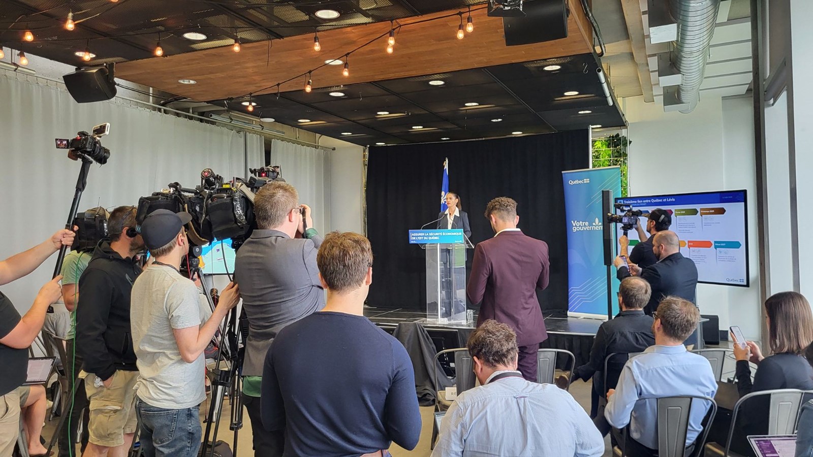 Les médias étaient nombreux pour le dévoilement du corridor du troisième lien entre Québec et Lévis.