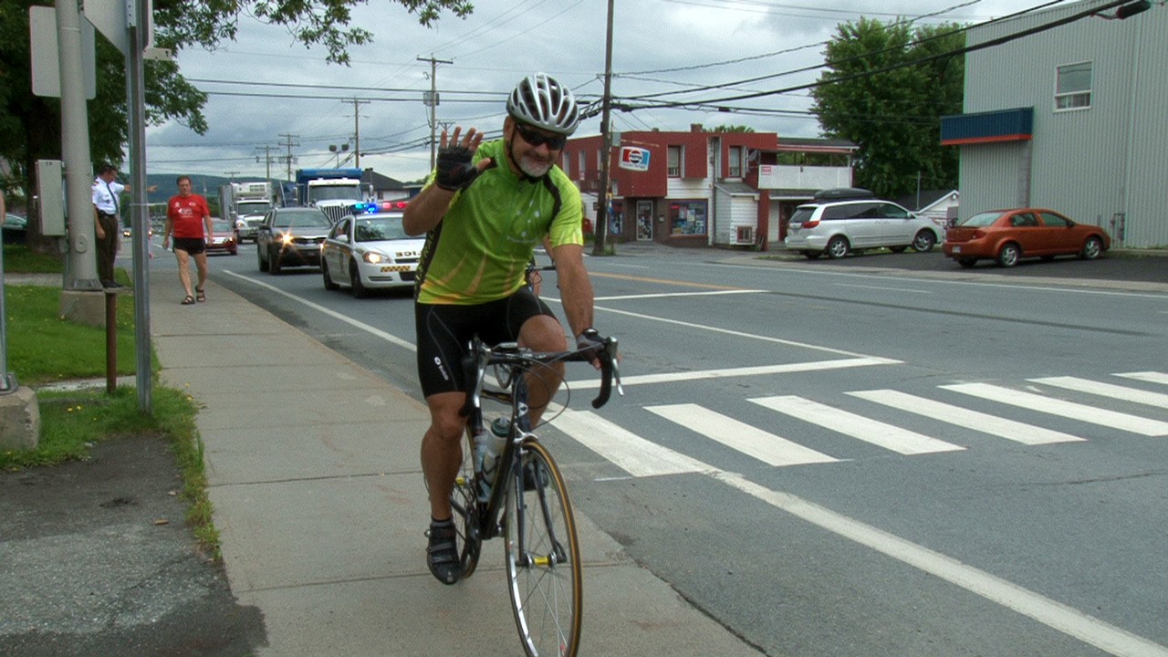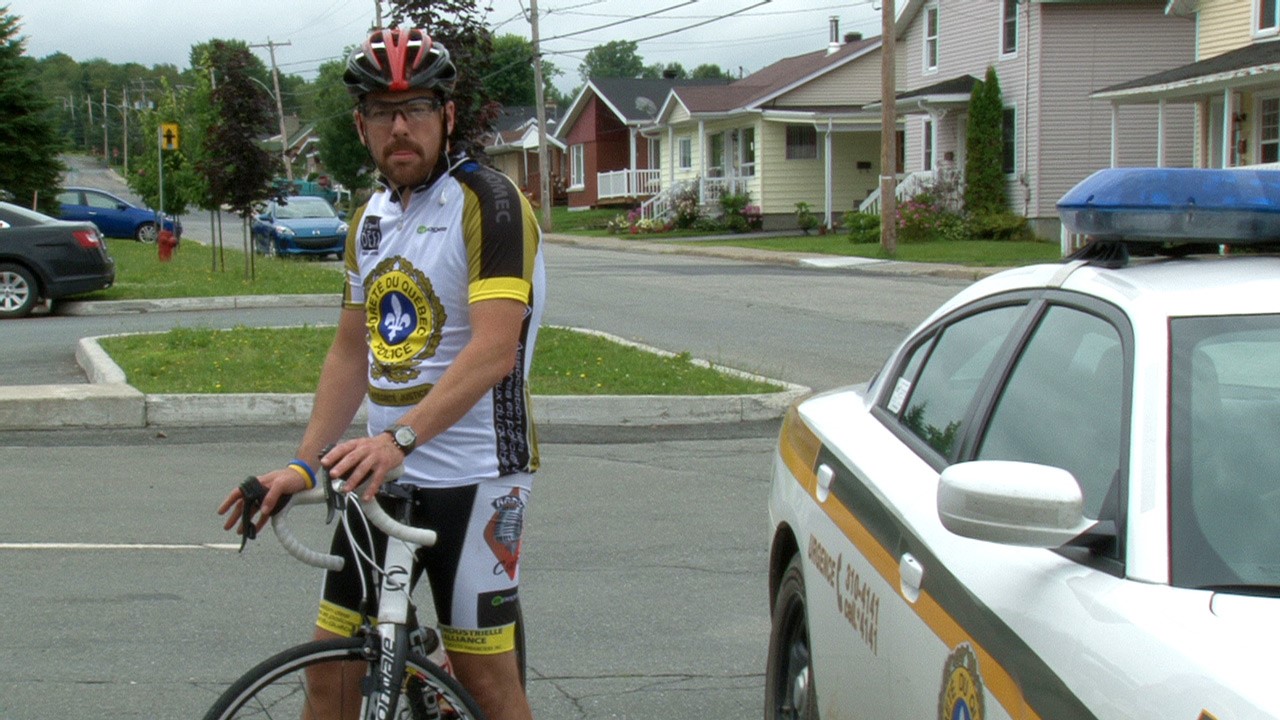 Photo: Julio TrepanierPrès d'une dizaine de policiers et civils de la Sûreté du Québec ont enfourché leur vélo à Percé en direction de Lac-Mégantic, en compagnie du Beauceron Eric Boucher. Ce dernier est actuellement enquêteur pour la SQ à Chandler.
