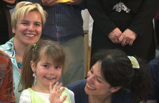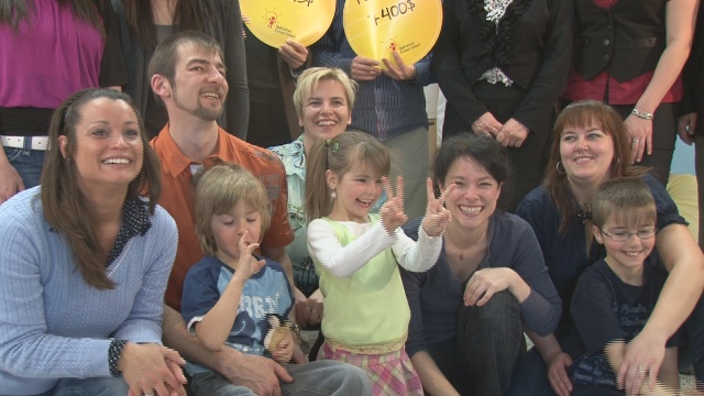 La famille Gagnon est entourée des animatrices Isabelle Cyr et Sophie Chiasson ainsi que par la directrice adjointe de l'hôpital Saint-Georges Marie-Josée Gamache