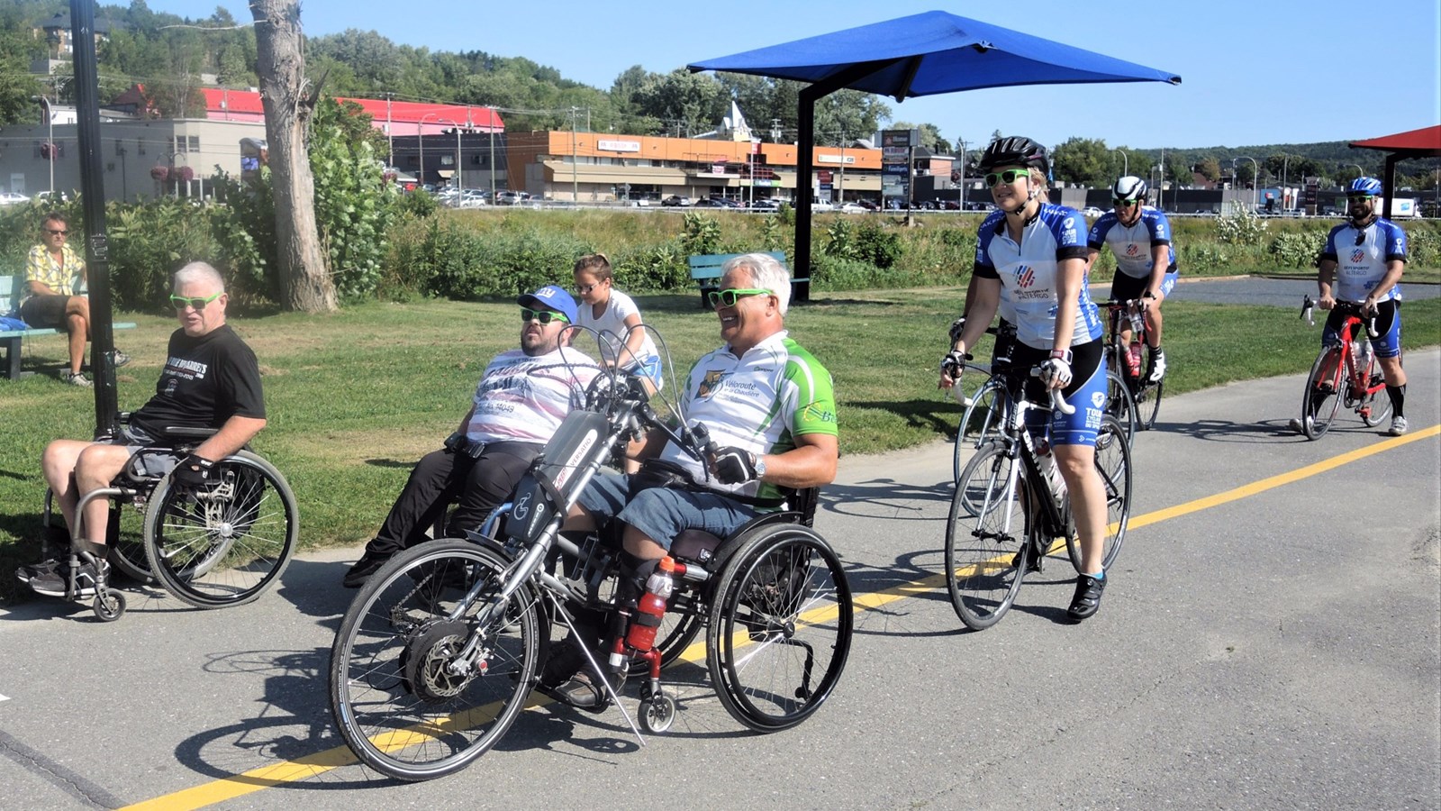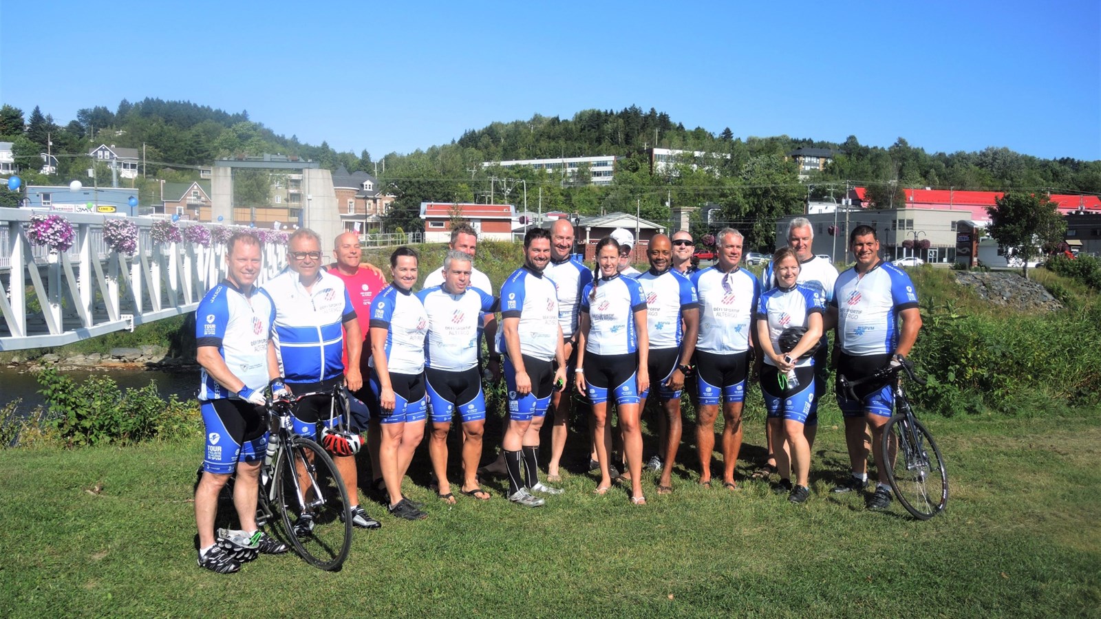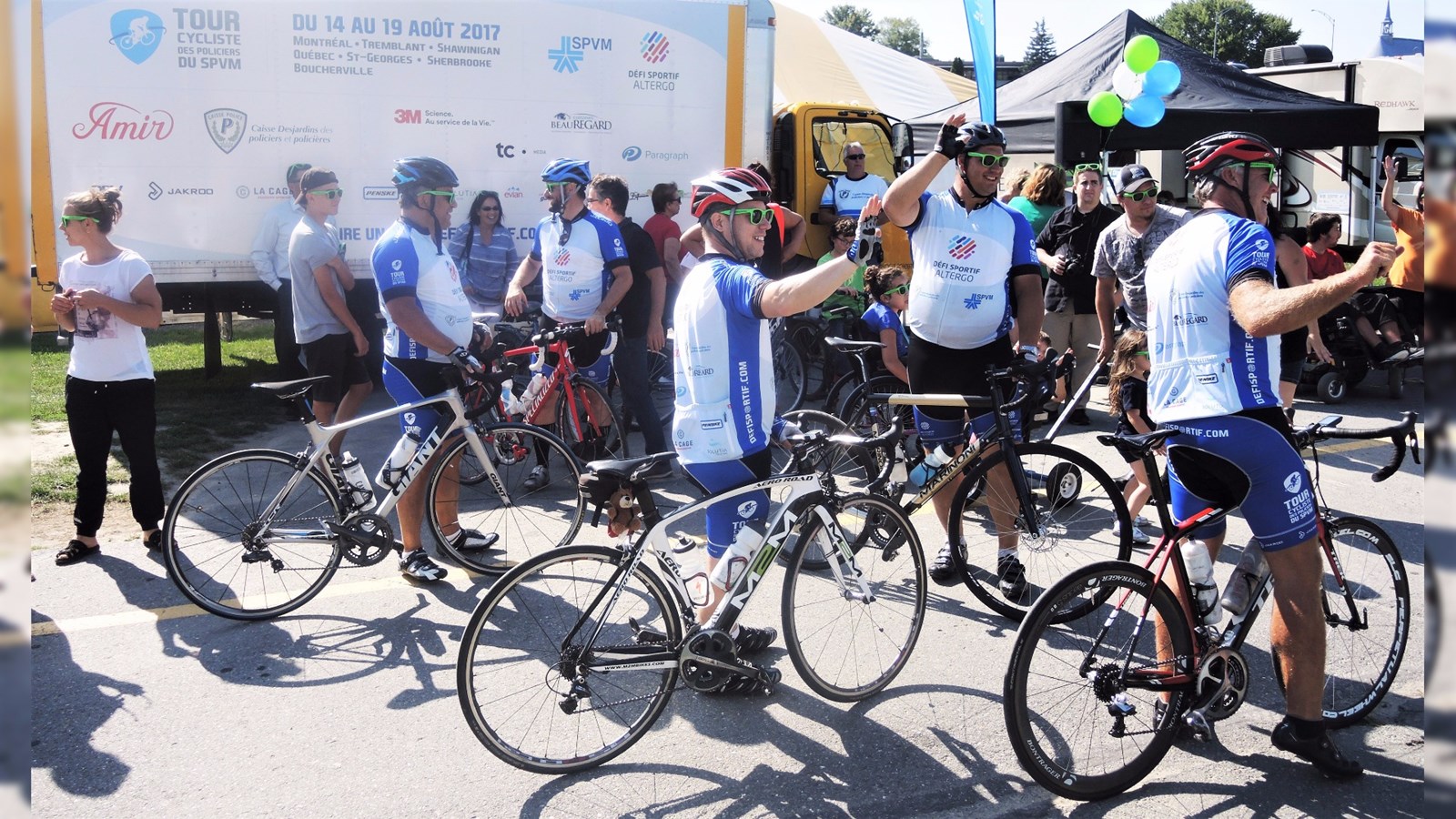 Des agents du Service de Police de la Ville de Montréal (SPVM) étaient de passage sur l'Île Ronde à Beauceville hier après-midi, le jeudi 17 août, dans le cadre de leur Tour cycliste au profit des jeunes athlètes du Défi sportif AlterGo.