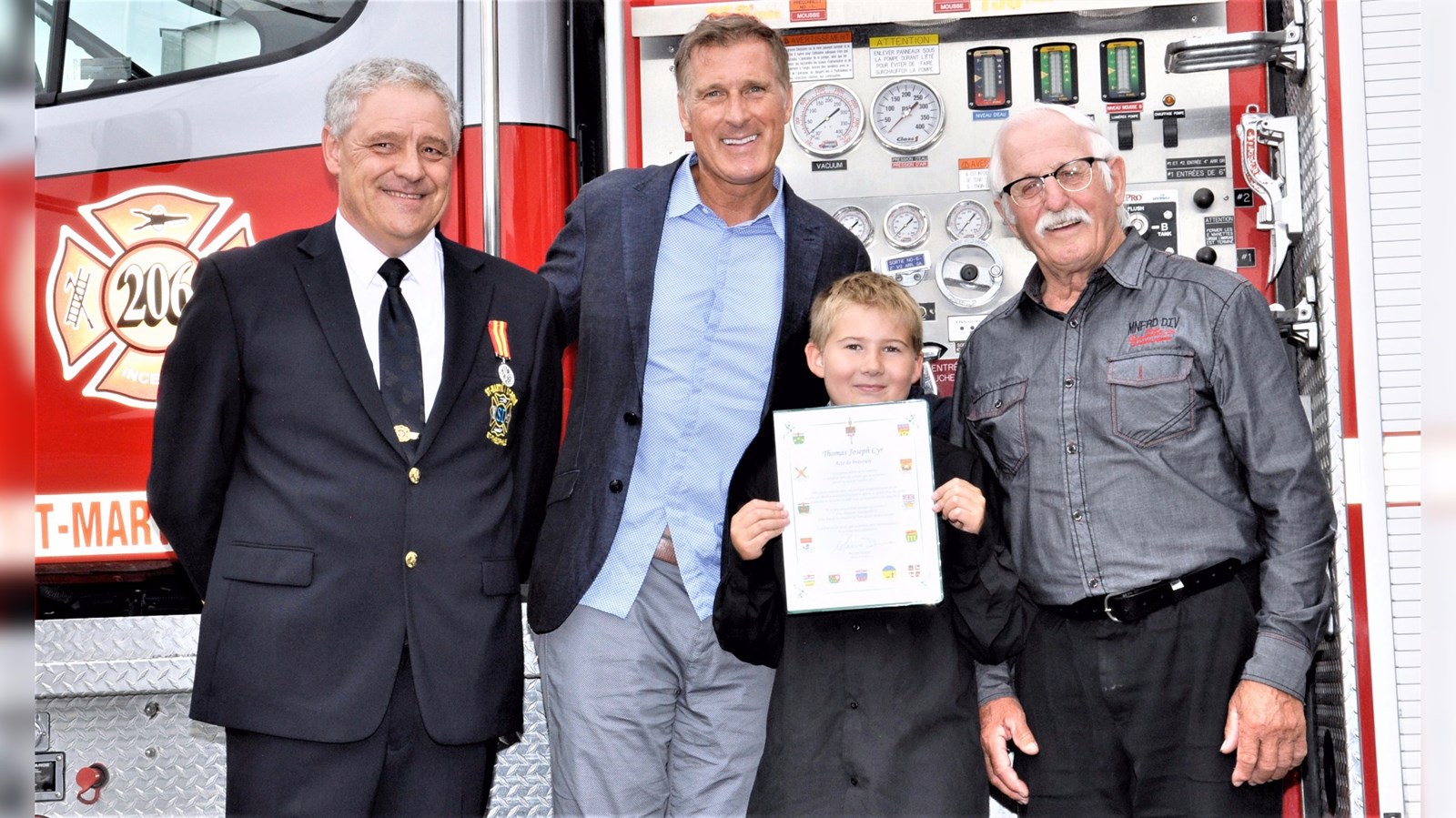 Thomas Joseph Cyr, âgé de 9 ans et originaire de Saint-Martin, reçoit un certificat d'acte de bravoure de la part du député de Beauce, Maxime Bernier. Ils sont entourés du directeur du Service de sécurité incendie de Saint-Martin, Saint-René et Saint-Théophile, Stéphane Maheux, à gauche, et du maire de Saint-Martin, Jean-Marc Paquet, à droite.