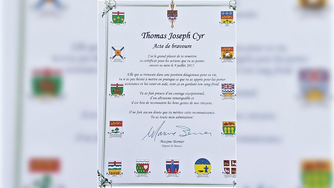 Le certificat d'acte de bravoure qu'a remis le député de Beauce Maxime Bernier au jeune Thomas Joseph Cyr de Saint-Martin.