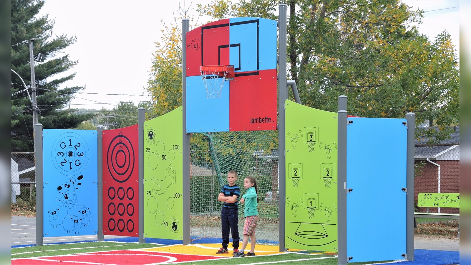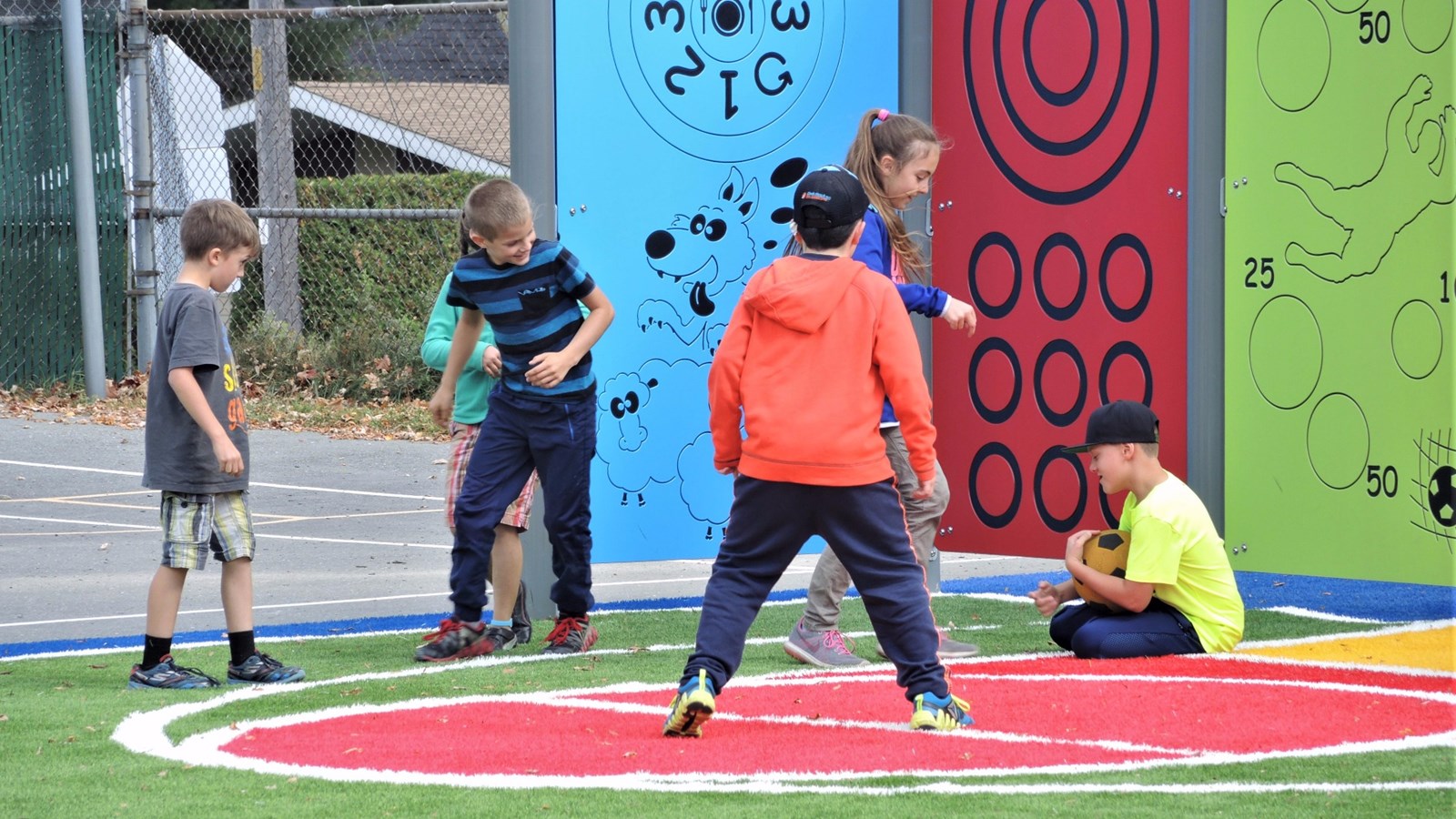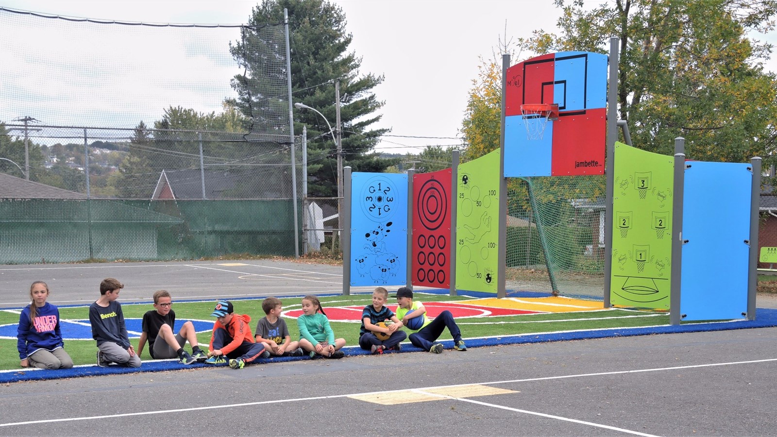 Le nouveau terrain multisports de l'école primaire Monseigneur-Fortier à Saint-Georges est non seulement doté d'un terrain de soccer synthétique et de deux paniers de basketball, mais il comporte également 18 panneaux d'activités qui permettent aux élèves de jouer à divers jeux de vitesse, d'adresse ou de parcours.