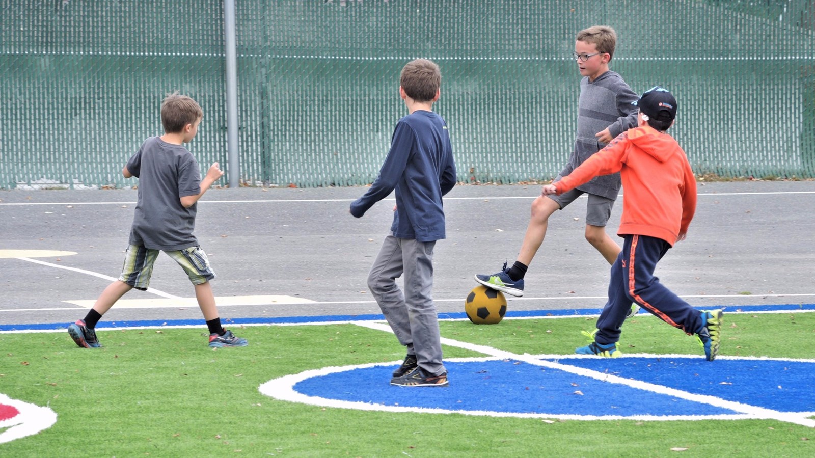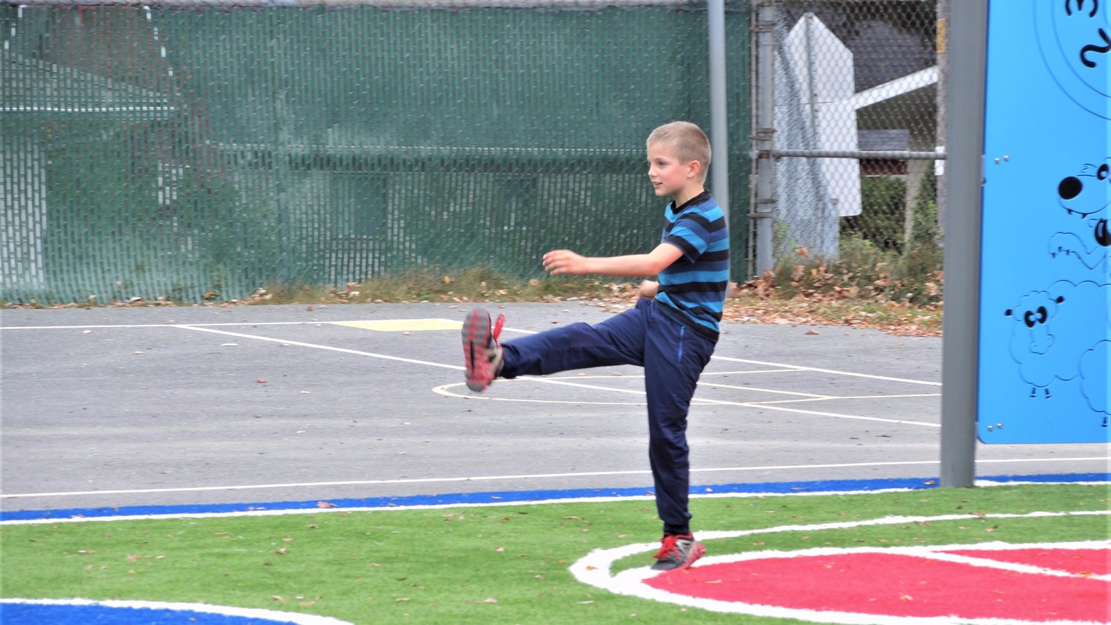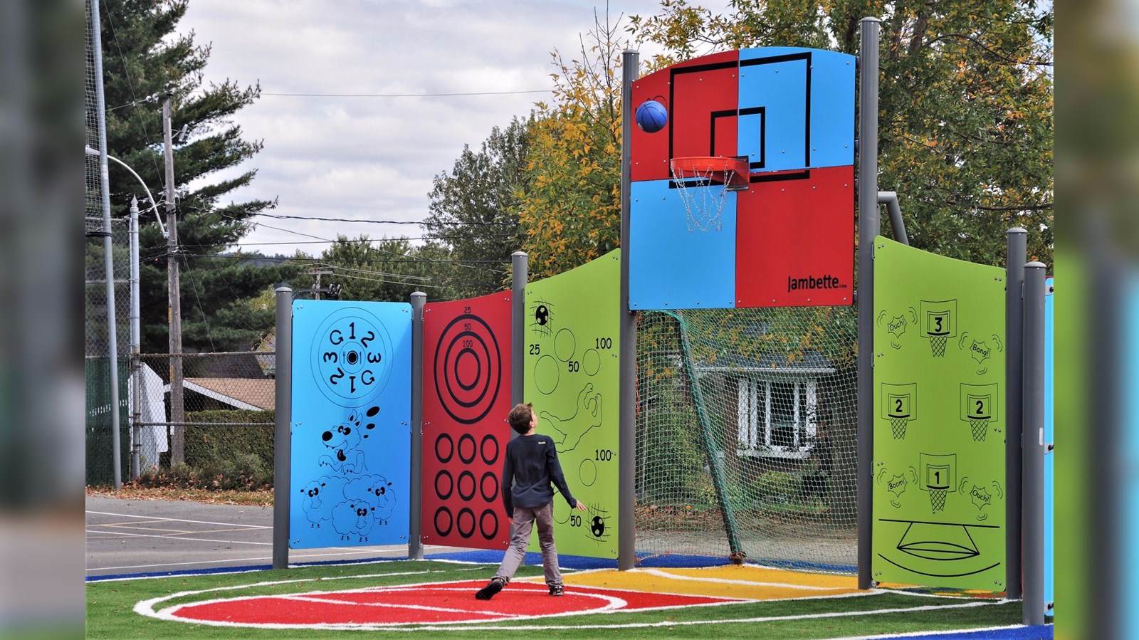 Le nouveau terrain multisports de l'école primaire Monseigneur-Fortier à Saint-Georges est non seulement doté d'un terrain de soccer synthétique et de deux paniers de basketball, mais il comporte également 18 panneaux d'activités qui permettent aux élèves de jouer à divers jeux de vitesse, d'adresse ou de parcours.