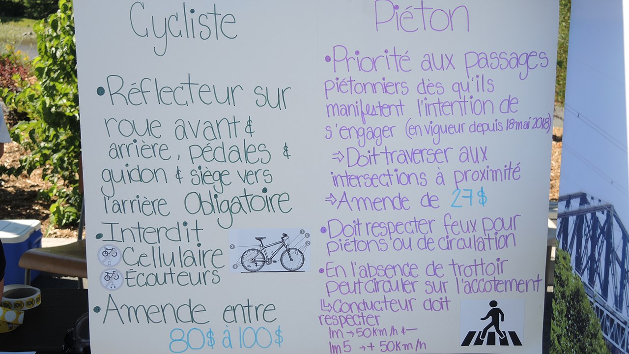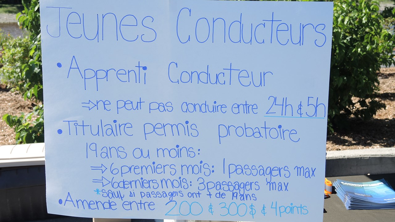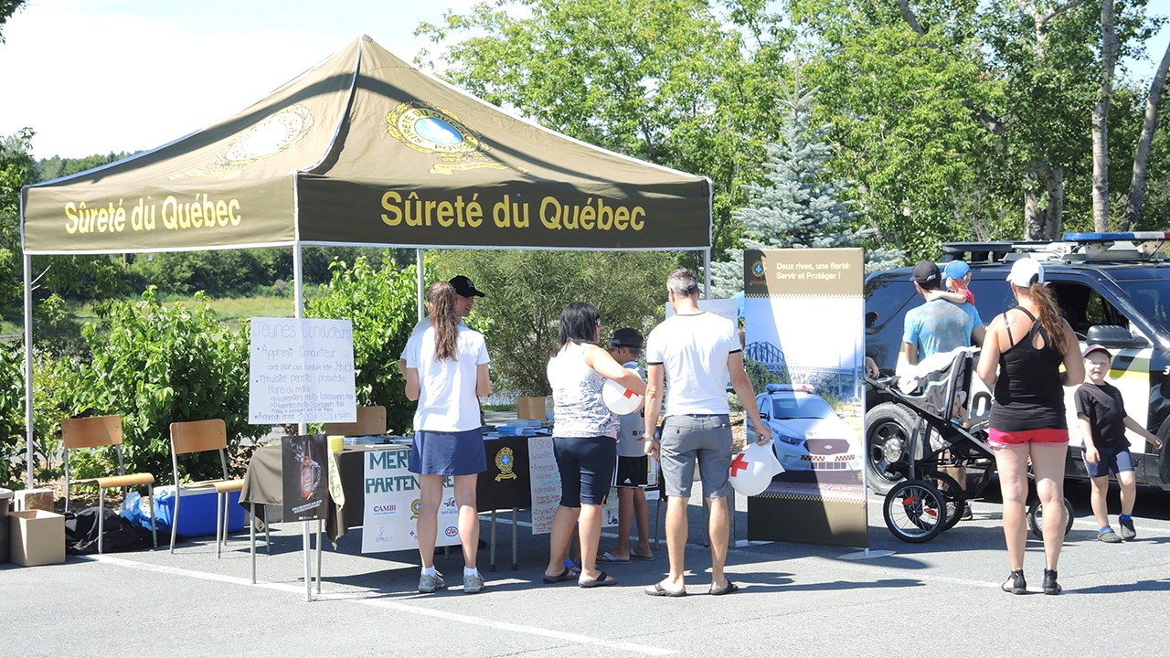 Le kiosque de la SQ, auquel étaient présents Vincent Gilbert et Émilie Toupin, ont principalement dispensé des informations au sujet des modifications récentes qui ont été apportées au Code de la sécurité routière du Québec, que ce soit par rapport à l'utilisation du téléphone cellulaire au volant ou encore à l'alcool au volant.