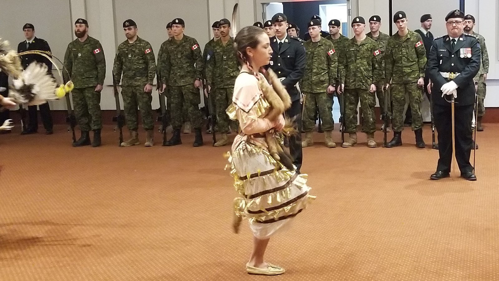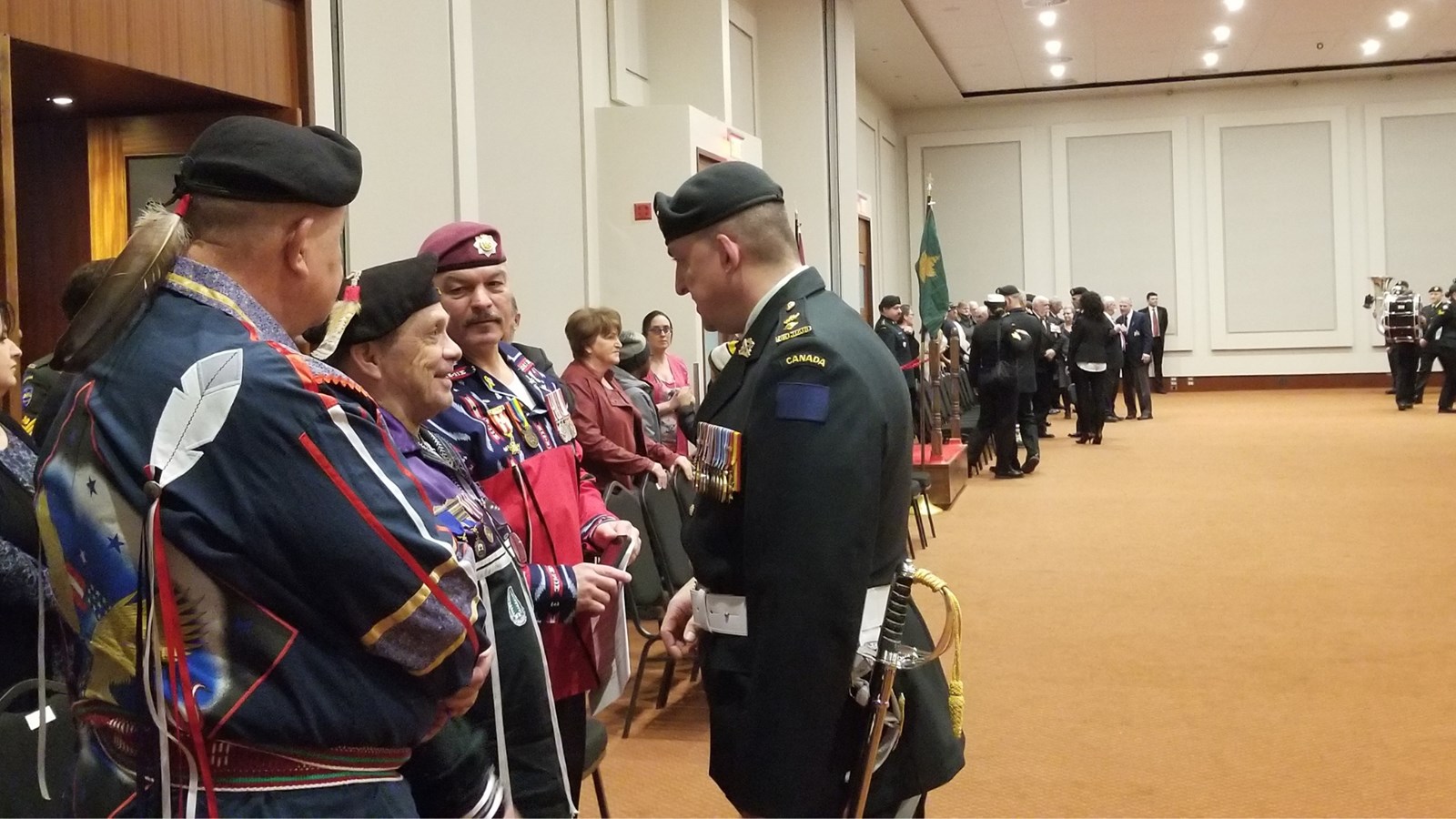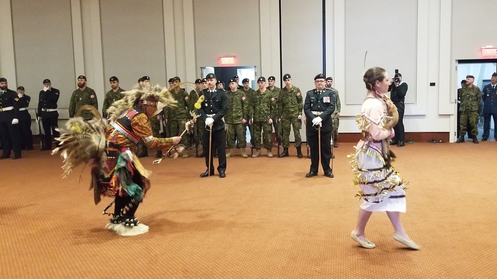 « J’affirme que nous sommes tous interreliés dans notre petite histoire de 450 ans. Je suis très fier de partager ce moment avec les peuples autochtones ayant œuvré en partenariat avec nous à ces batailles, de surcroît que leur histoire continue de se tisser avec celle des Forces armées canadiennes. » Lieutenant-colonel François Provost