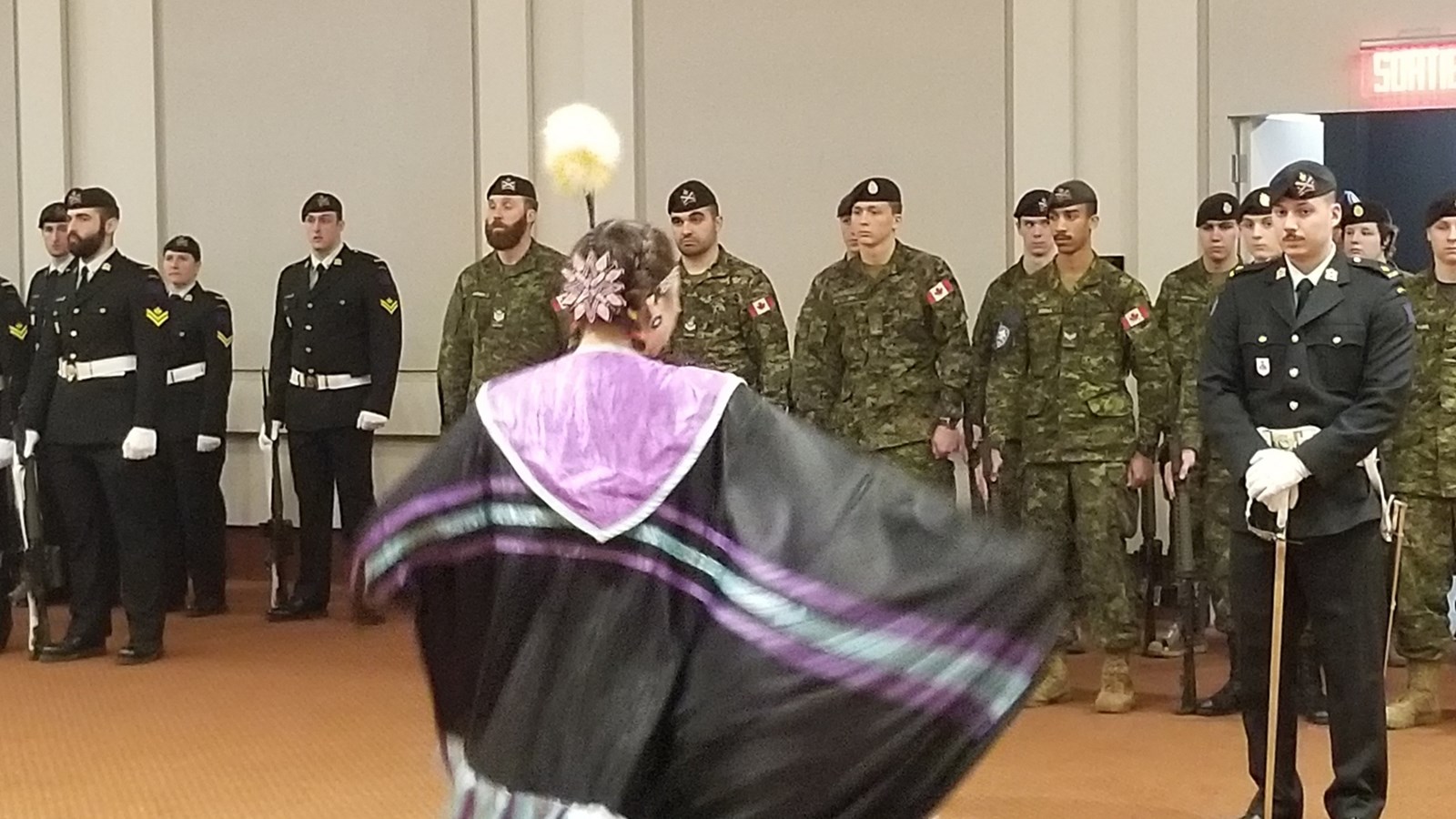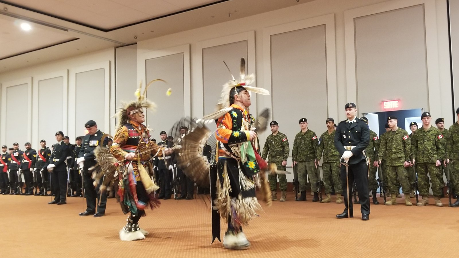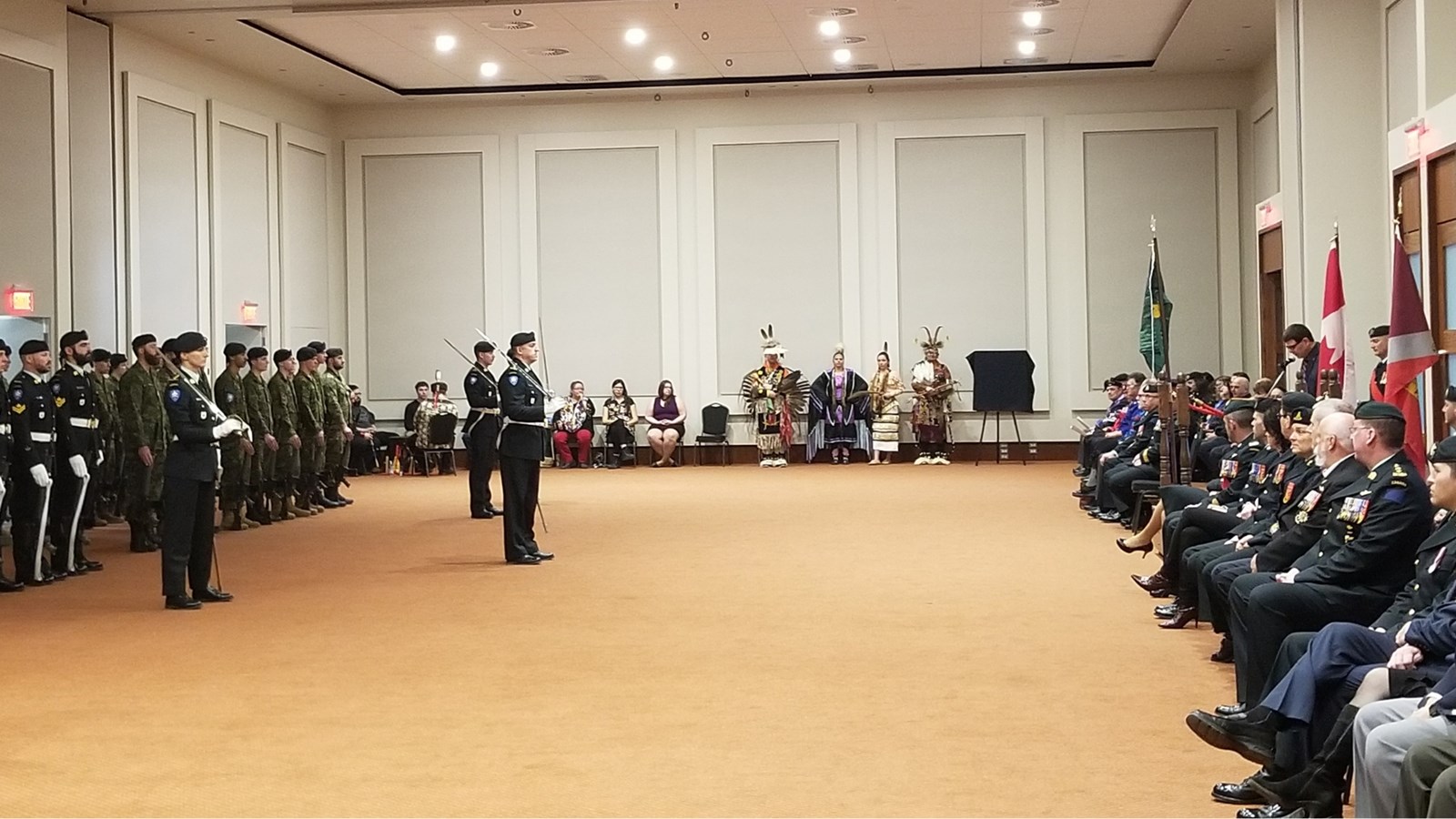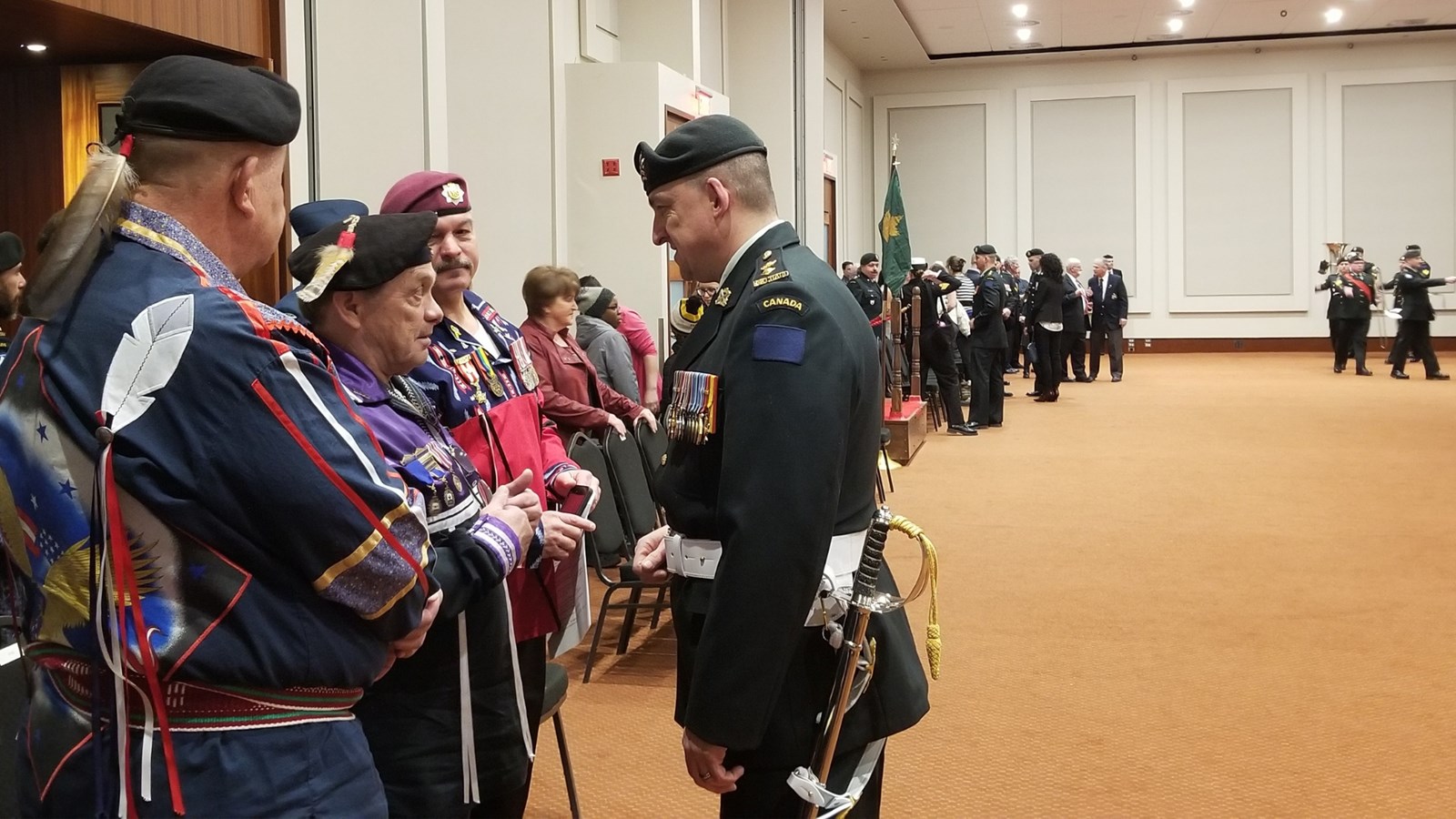 « J’affirme que nous sommes tous interreliés dans notre petite histoire de 450 ans. Je suis très fier de partager ce moment avec les peuples autochtones ayant œuvré en partenariat avec nous à ces batailles, de surcroît que leur histoire continue de se tisser avec celle des Forces armées canadiennes. » Lieutenant-colonel François Provost