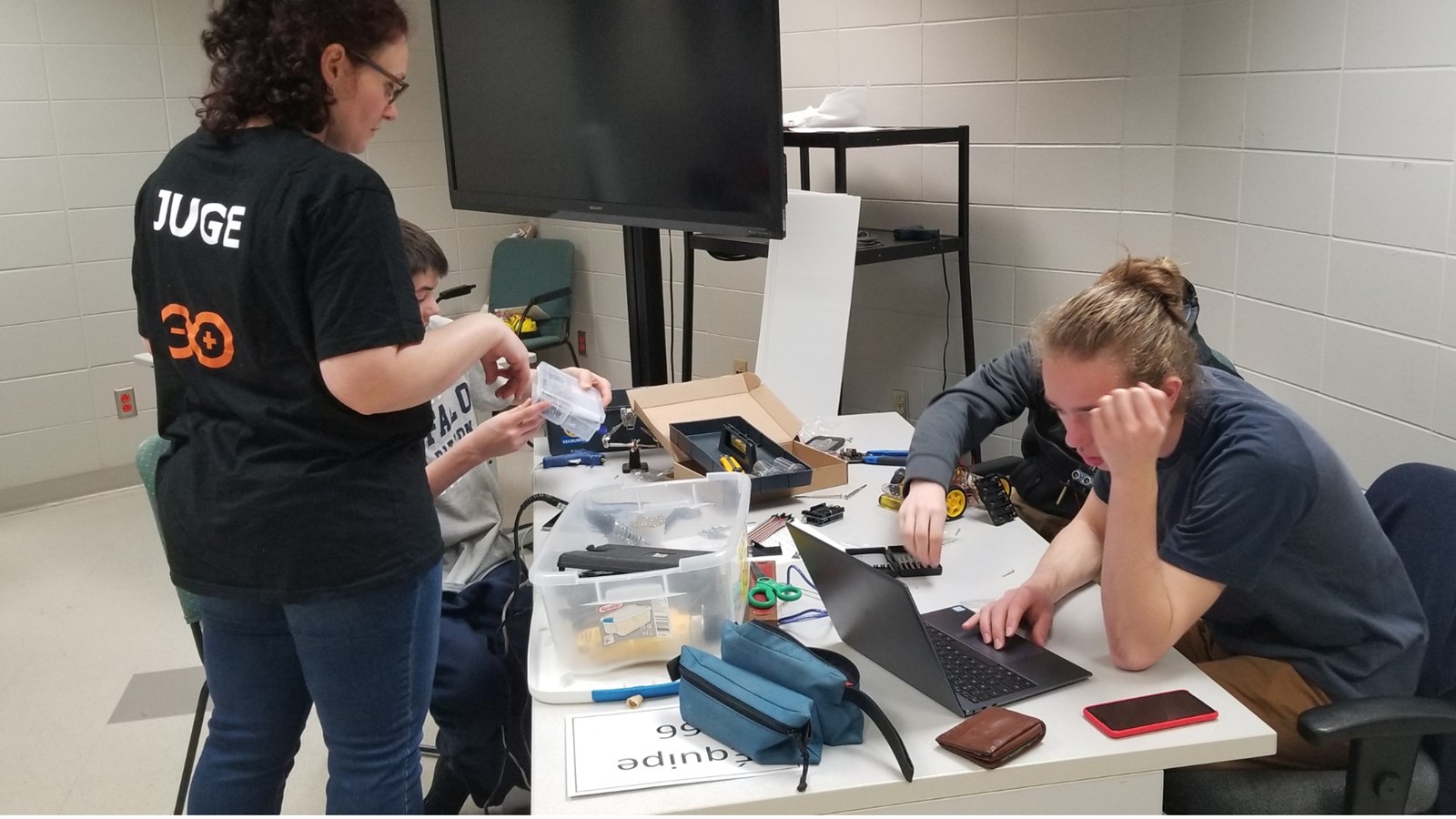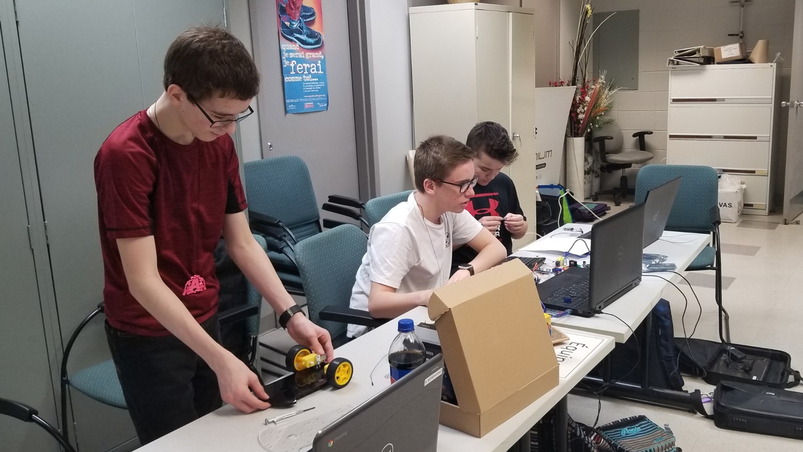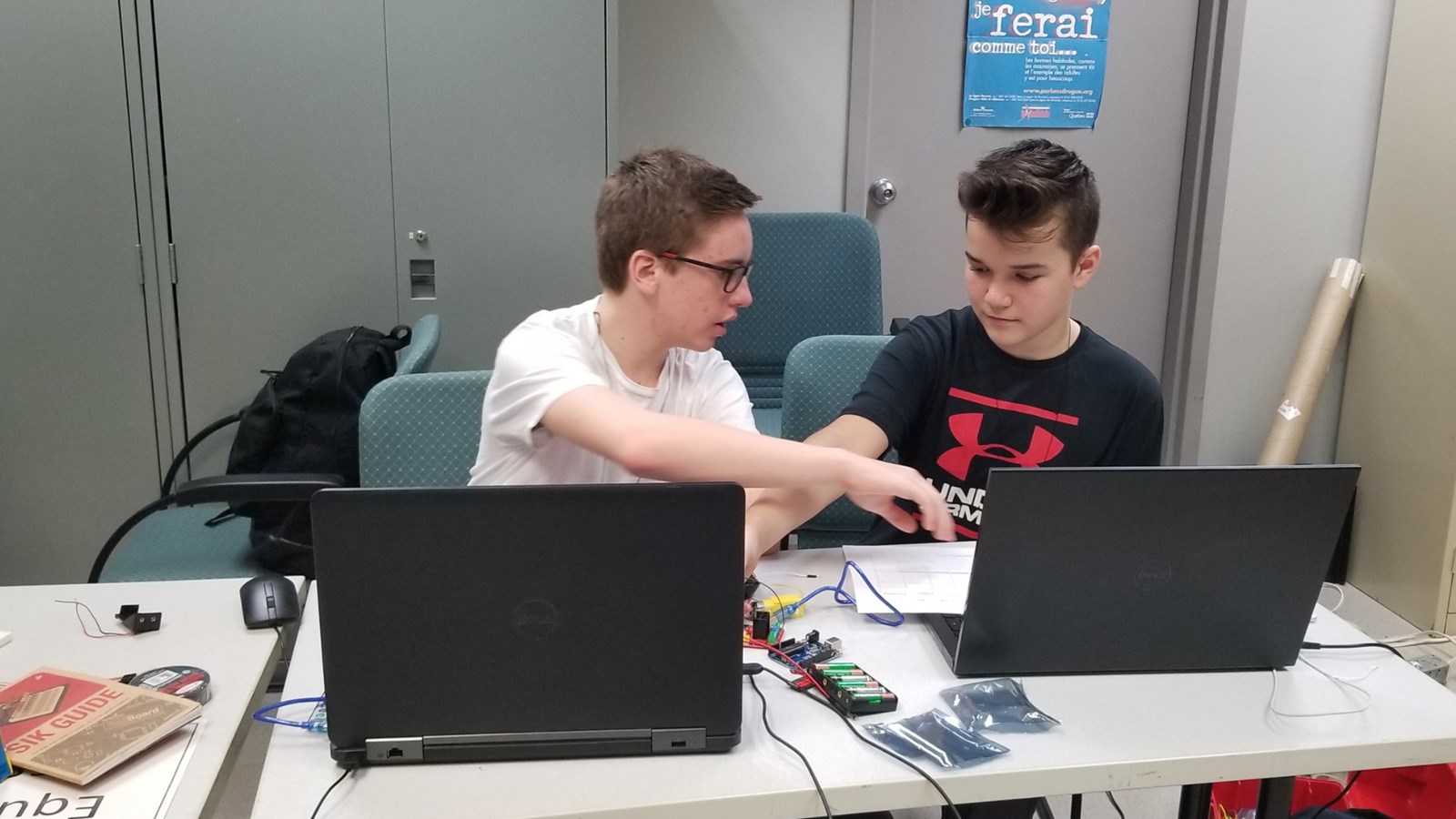 Les trois équipes participantes du secondaire venaient des écoles La Polyvalente de Saint-Georges, La Polyvalente Benoît-Vachon et La Polyvalente Saint-François. Ils devaient relever un Défi-découverte avec un robot de la technologie Arduino. La juge responsable, Chantal Poulin, conseillère pédagogique en sciences du CSBE, leur a donné le matin même les pièces du robot qu’ils doivent monter, puis le programmer pour qu’il circule dans un labyrinthe qu’ils auront également conçu.