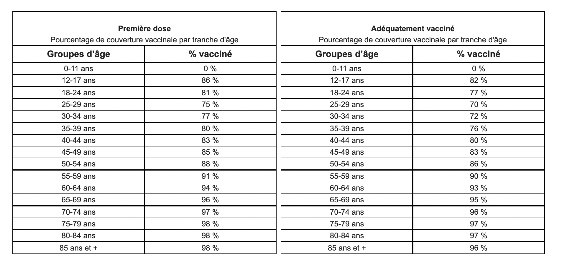 Depuis le 27 septembre, 3 167 3 852 doses de vaccin ont été administrées en Chaudière-Appalaches pour un total de 657 944 doses administrées à ce jour. Cela représente une couverture vaccinale pour la première dose de 76,8 % de la population de Chaudière-Appalaches. La couverture vaccinale des personnes adéquatement vaccinées (qui ont reçu leur 2e dose ou qui ont eu la COVID ainsi que leur dose unique) est de 74,4 %.