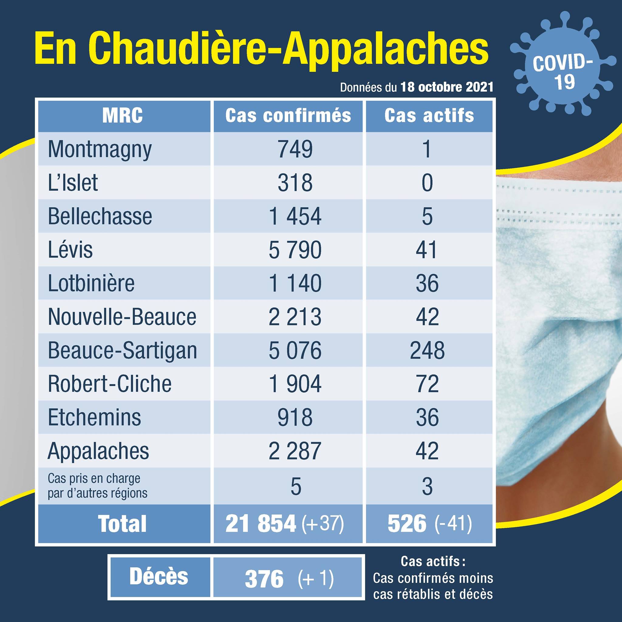 La Santé publique régionale rapporte aujourd'hui 37 nouveaux cas de COVID-19 en Chaudière-Appalaches, dont 27 en Beauce ainsi qu'un décès.