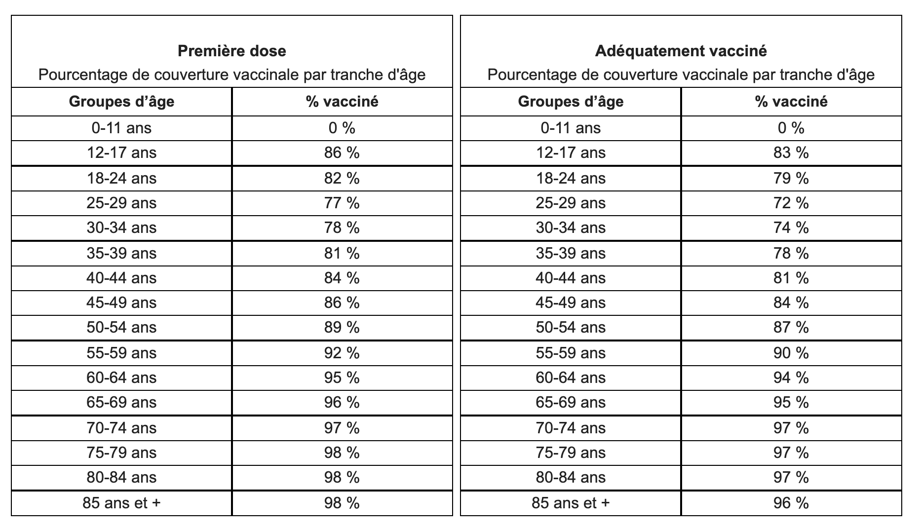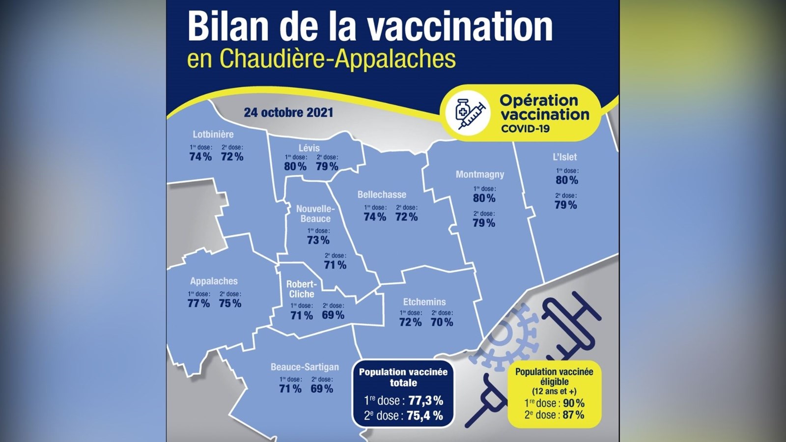 Depuis le 18 octobre, 2 724 doses de vaccin ont été administrées en Chaudière-Appalaches pour un total de 666 262 doses administrées à ce jour. Cela représente une couverture vaccinale pour la première dose de 77,3 % de la population de Chaudière-Appalaches. La couverture vaccinale des personnes adéquatement vaccinées (qui ont reçu leur 2e dose ou qui ont eu la COVID ainsi que leur dose unique) est de 75,4 %.