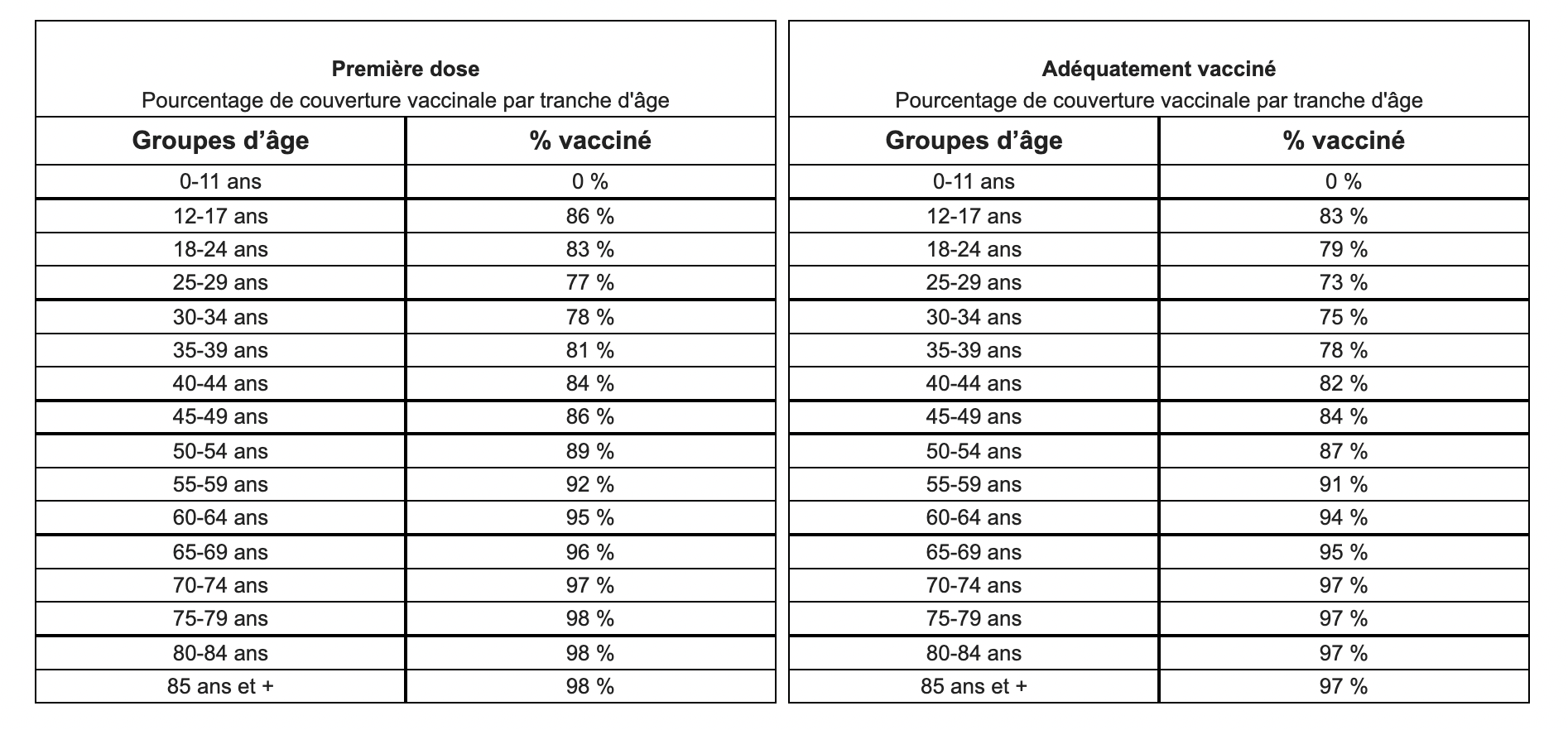 Depuis le 25 octobre, 3 916 doses de vaccin ont été administrées en Chaudière-Appalaches pour un total de 670 178 doses administrées à ce jour. Cela représente une couverture vaccinale pour la première dose de 77,4 % de la population de Chaudière-Appalaches. La couverture vaccinale des personnes adéquatement vaccinées (qui ont reçu leur 2e dose ou qui ont eu la COVID ainsi que leur dose unique) est de 75,7 %.