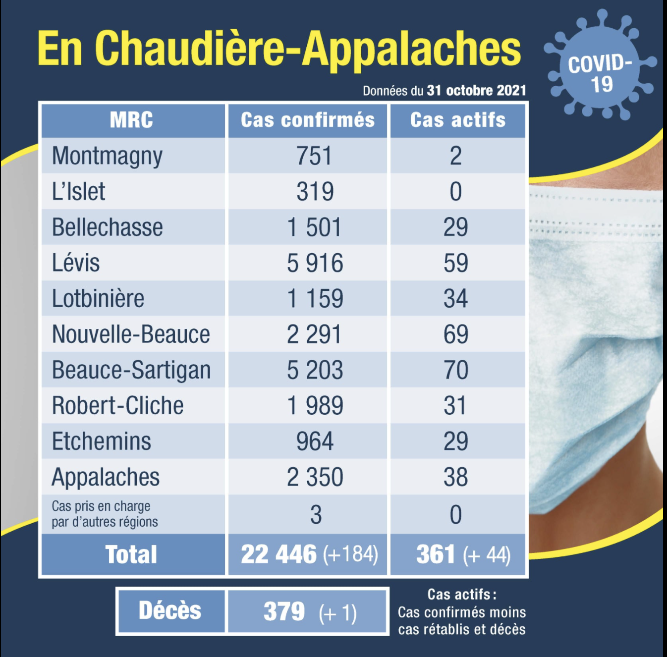 Dans l'ensemble du territoire administratif, le nombre de cas actifs est à 361, en augmentation de quatre depuis le 29 octobre.