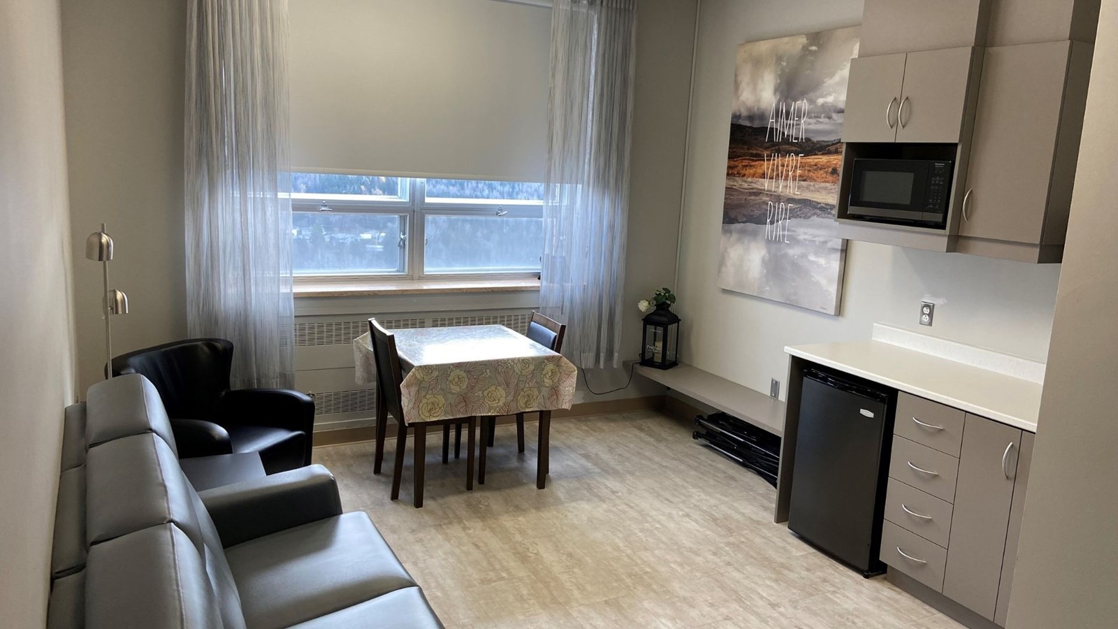 Une table, des rideaux, un divan ainsi que des électroménagers dans la cuisinette du salon adjacent, ont été installés dans cette chambre afin d'assurer un lieu de recueillement calme et serein pour le résident en fin de vie et ses proches.