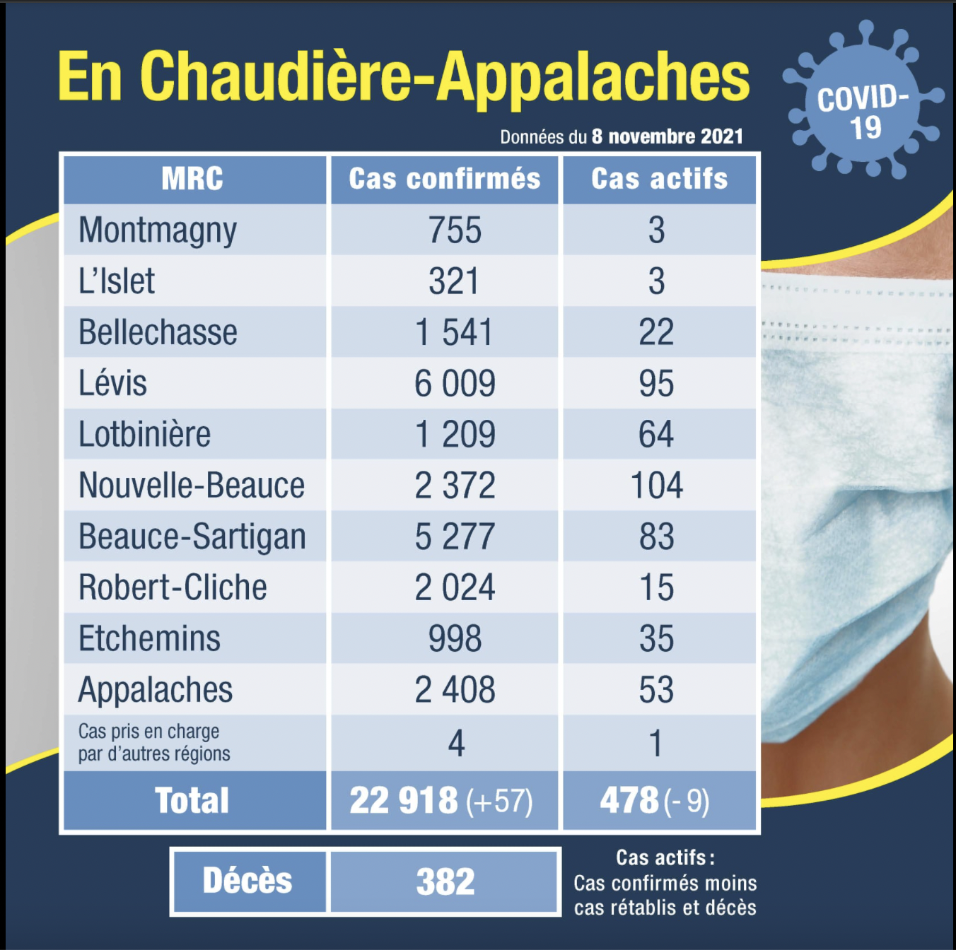 Le nombre de cas actifs pour la région administrative est désormais de 478, en baisse de 9.