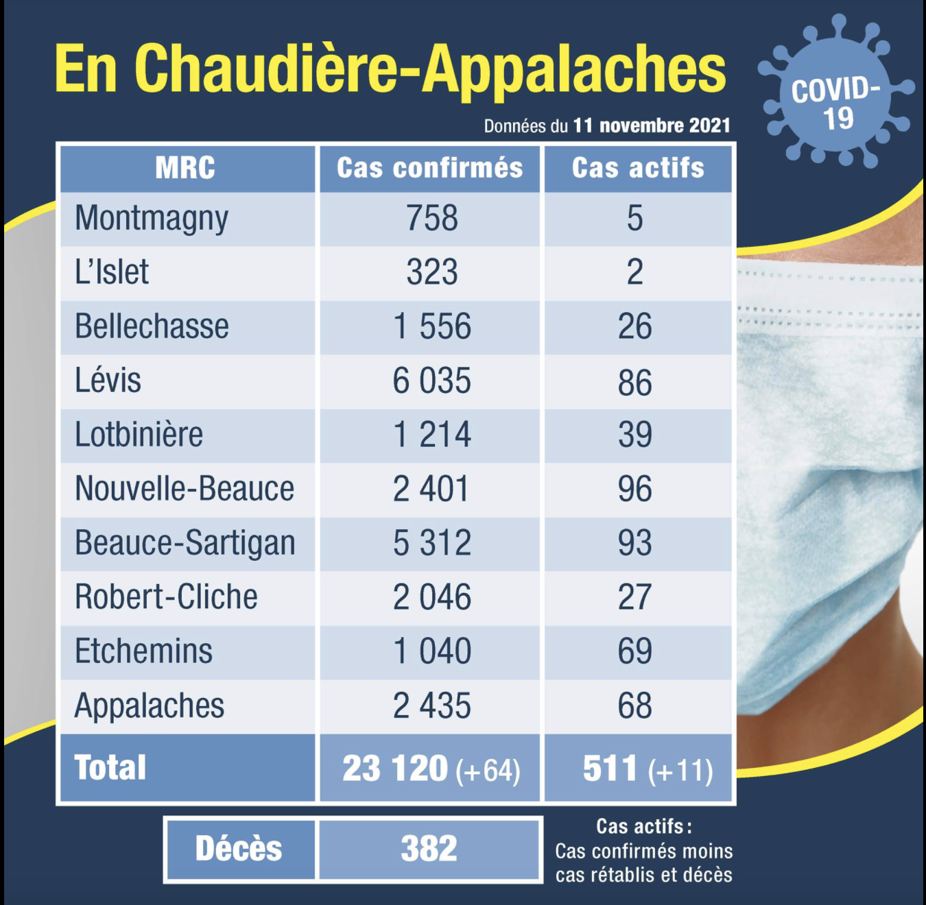Le nombre de cas actifs pour la région administrative atteint 511, en hausse de onze.