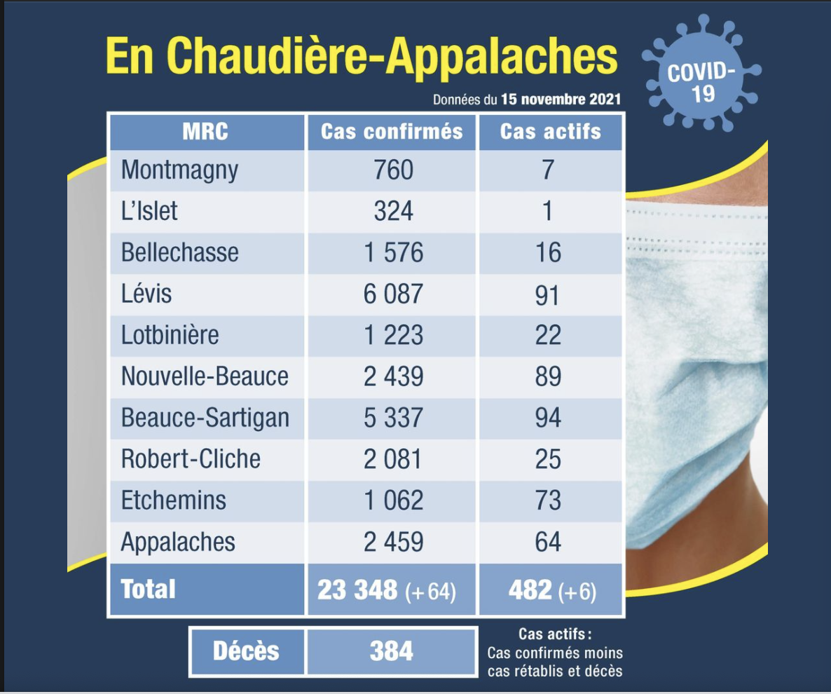 Le bilan de la Santé publique régionale publié aujourd'hui fait état de 64 nouveaux cas de COVID-19 diagnostiqués sur le territoire de Chaudière-Appalaches .