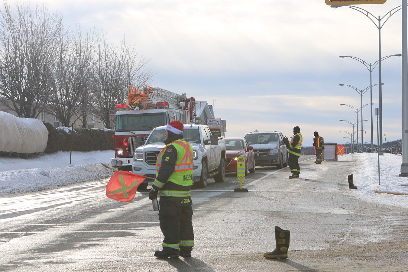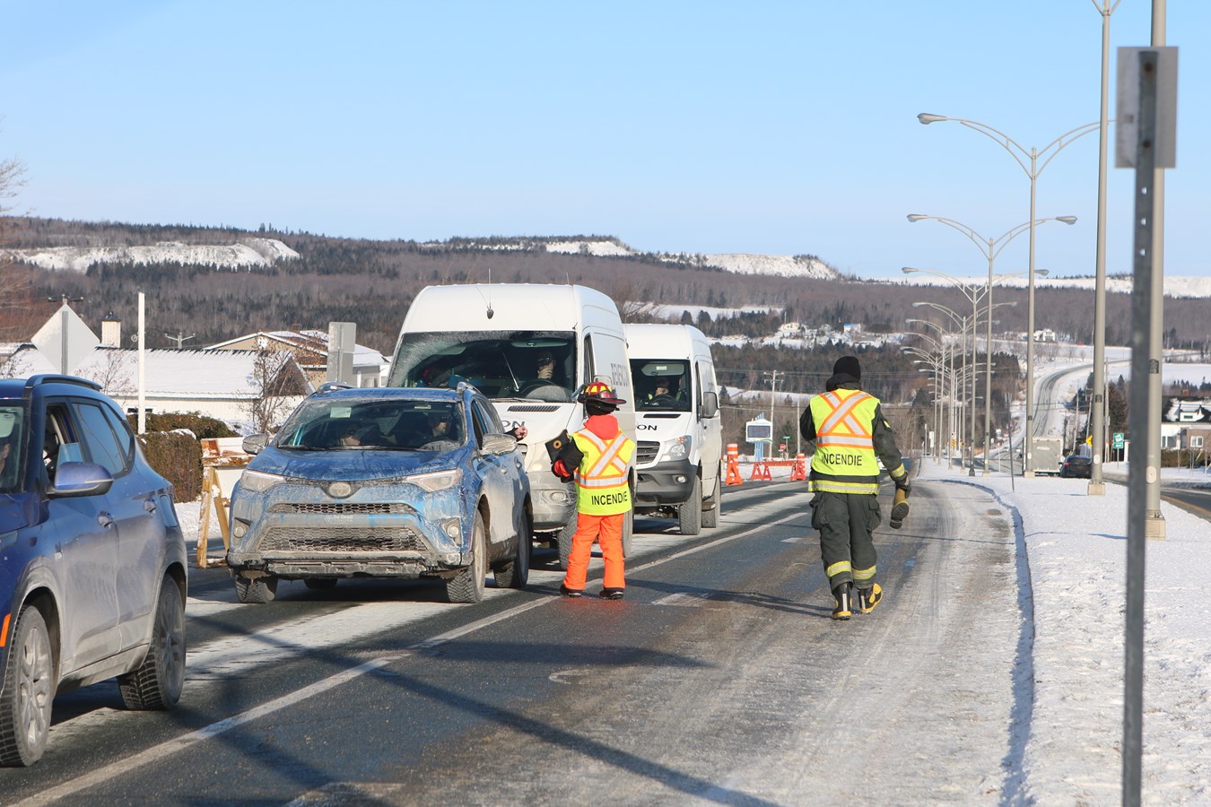 Installés au croisement de l'avenue du Collège et de la route 112, les pompiers se sont relayés entre 10 h et 15 h de façon à toujours être une dizaine sur place.