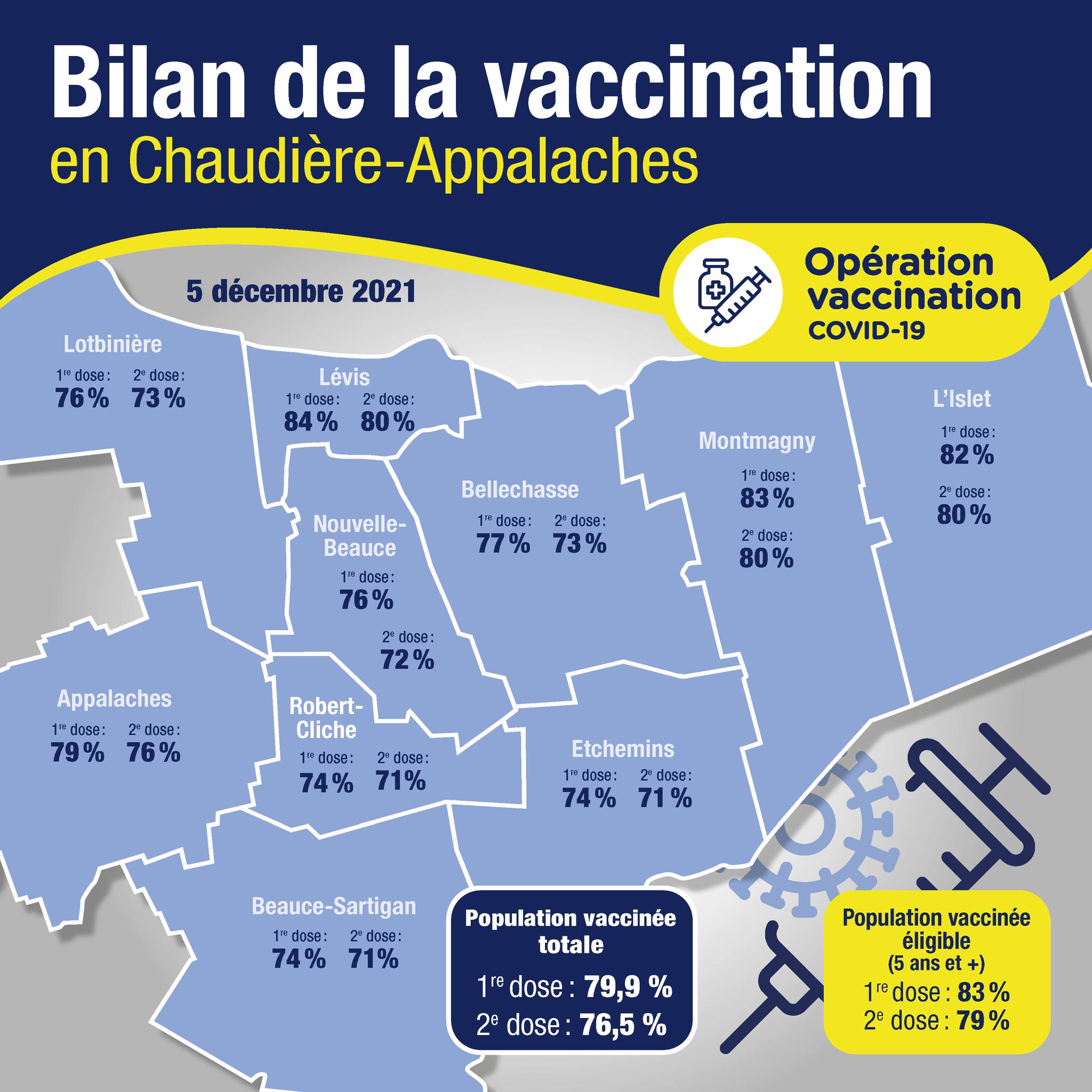 Cela représente une couverture vaccinale pour la première dose de 79,9 % de la population de Chaudière-Appalaches. La couverture vaccinale des personnes adéquatement vaccinées (qui ont reçu leur 2e dose ou qui ont eu la COVID ainsi que leur dose unique) est de 76,5 %.
