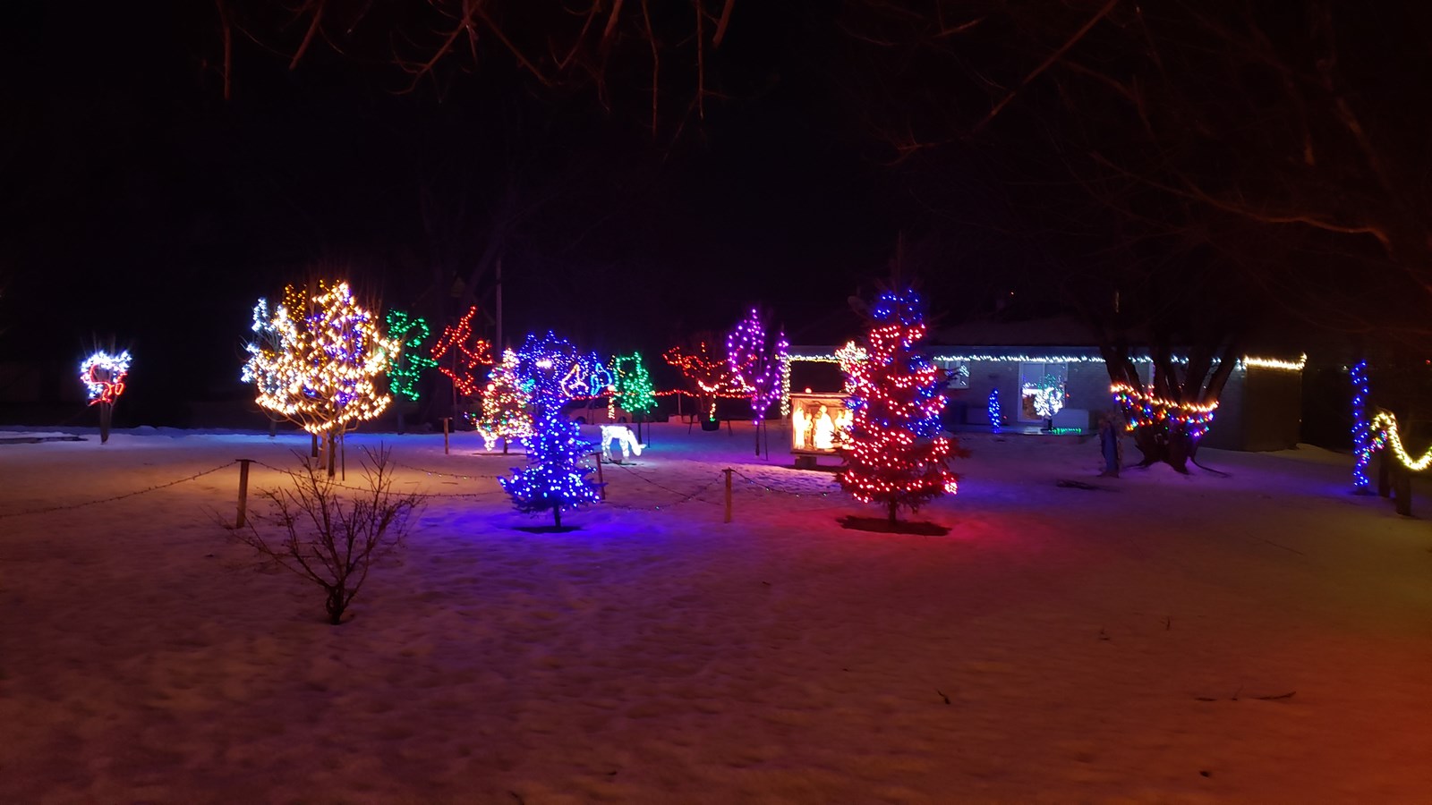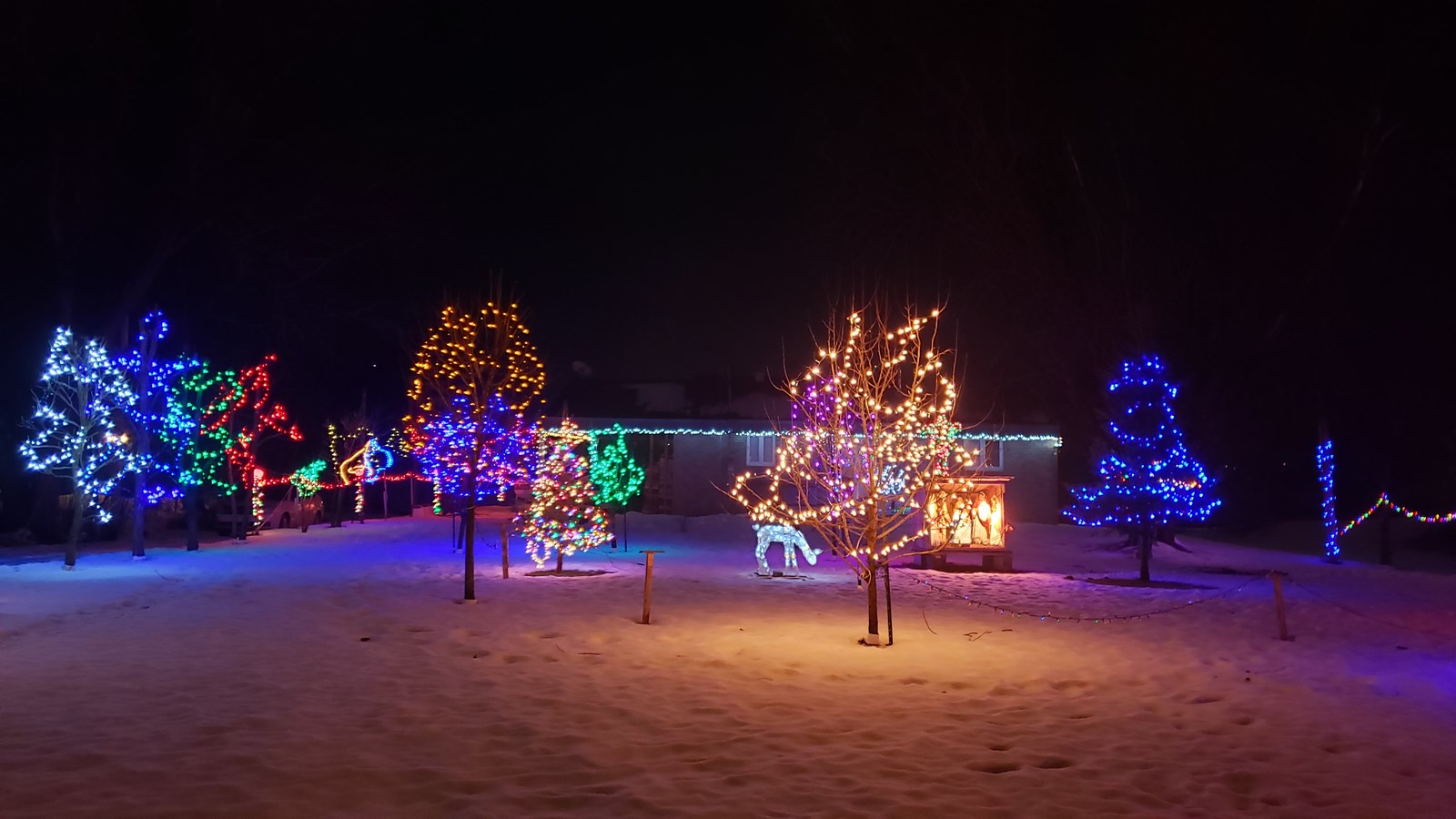 Impossible de rater cette maison lorsque l'on s'approche du Manoir de la Roselière à Notre-Dame-des-Pins. D'avant en arrière, du bleu, du vert, du rouge, la crèche et un petit faon illuminent ce terrain pour le plus grand plaisir des résidents.