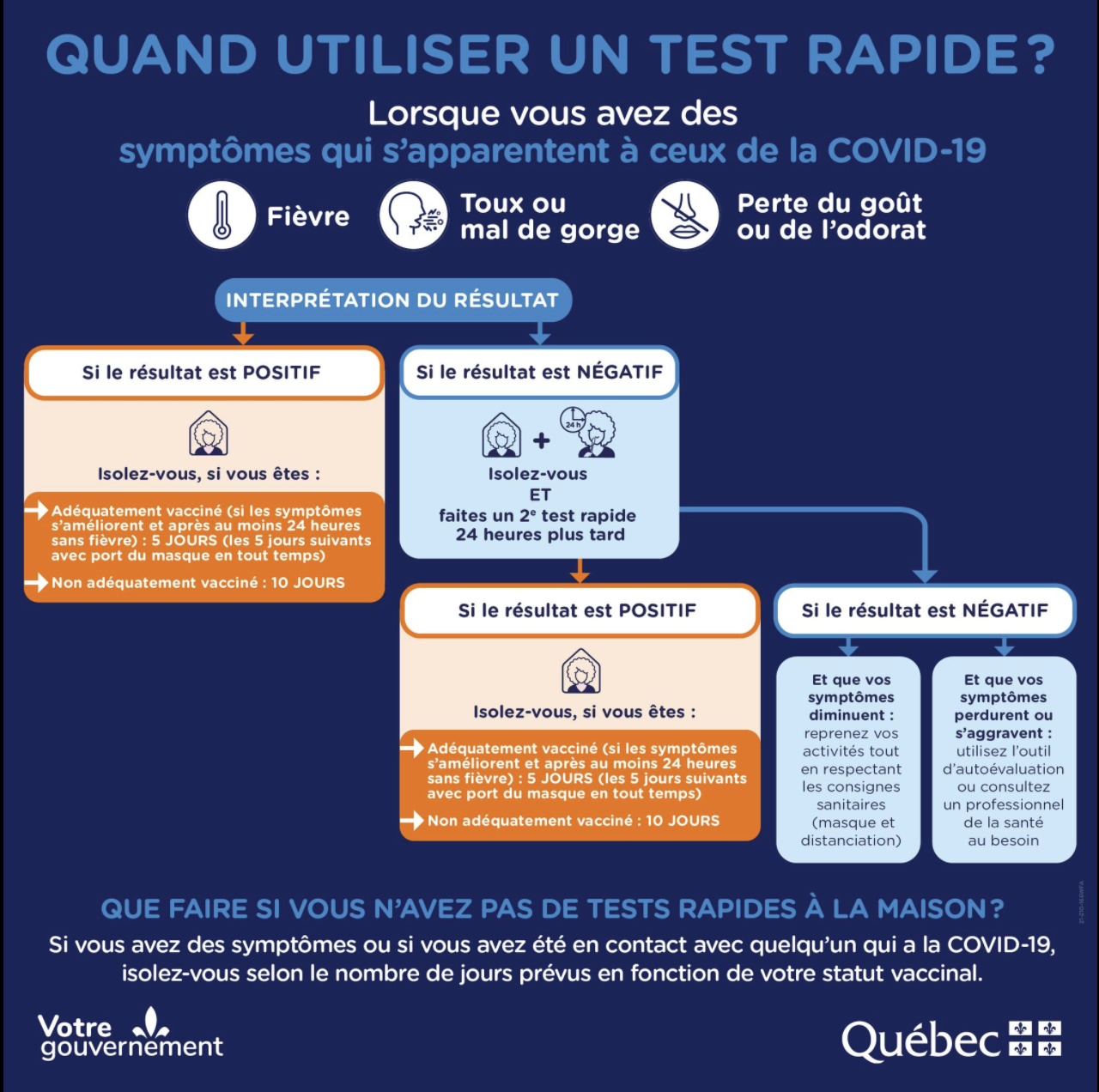Le ministère demande aux gens qui ont des symptômes qui s’apparentent à ceux du virus : fièvre, toux ou mal de gorge, perte du goût ou de l’odorat, de s’isoler immédiatement. Par contre, le nombre de jours dépend de la vaccination.