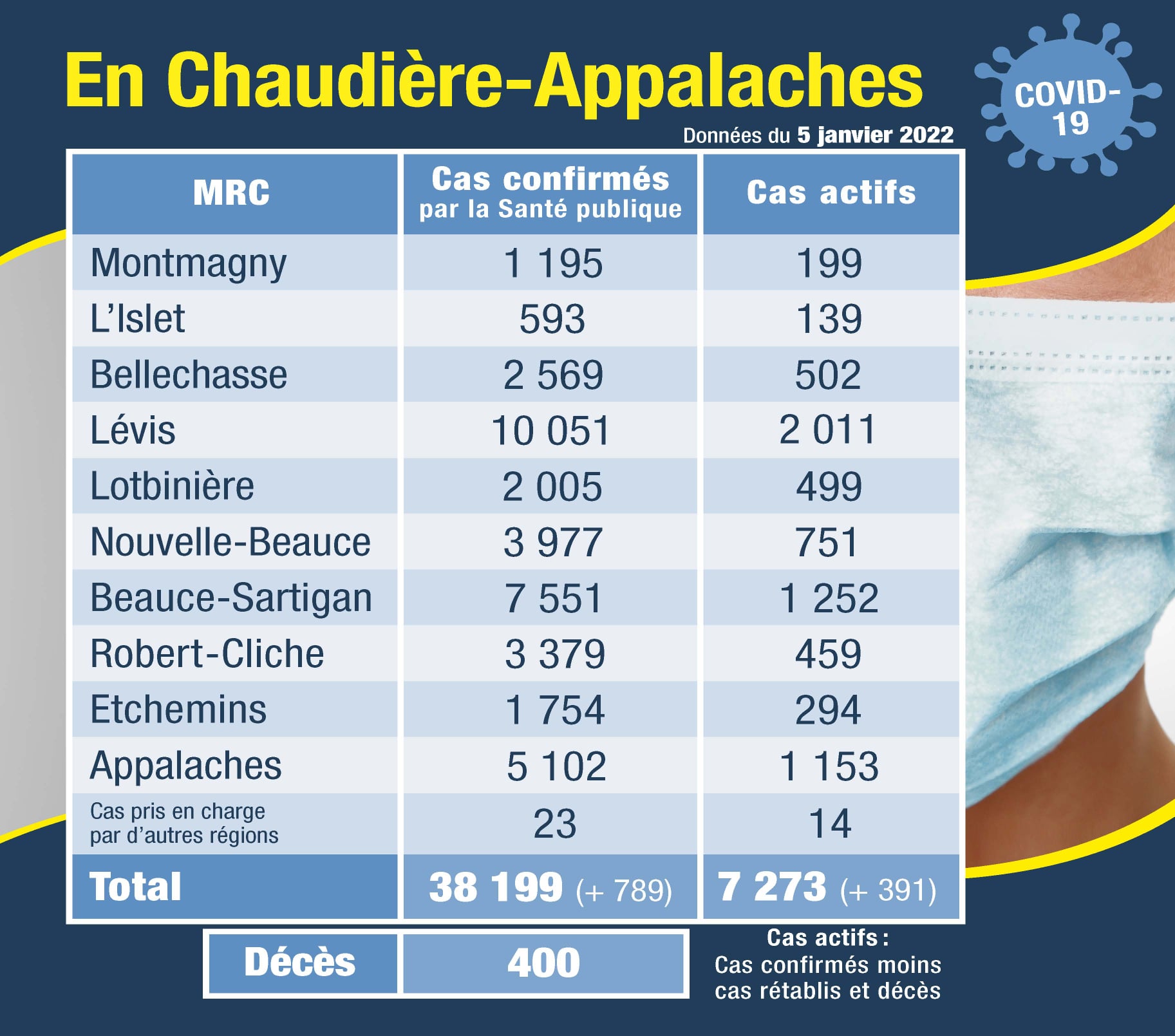 Un total de 789 nouveaux cas positifs à la COVID-19 ont été confirmés par la Santé publique de Chaudière-Appalaches dans son bilan quotidien.