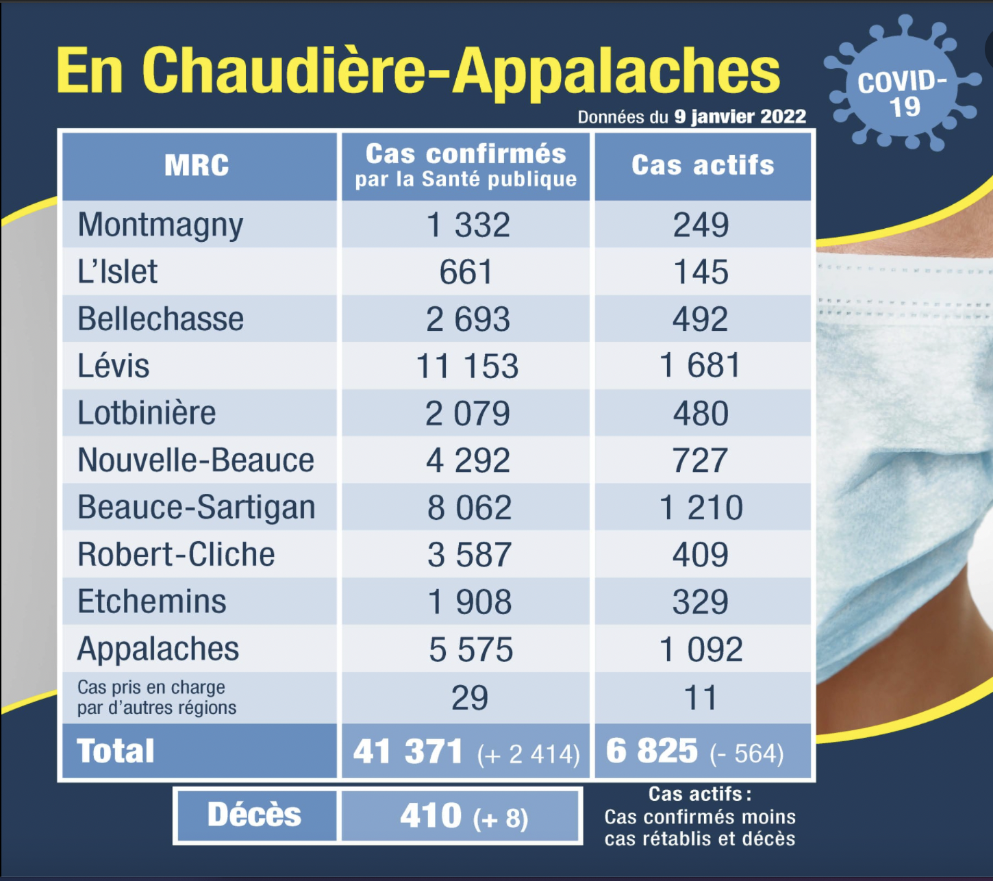 Un total de 2 414 nouveaux cas positifs à la COVID-19 et huit nouveaux décès ont été confirmés cette fin de semaine par la Santé publique de Chaudière-Appalaches dans son bilan quotidien.