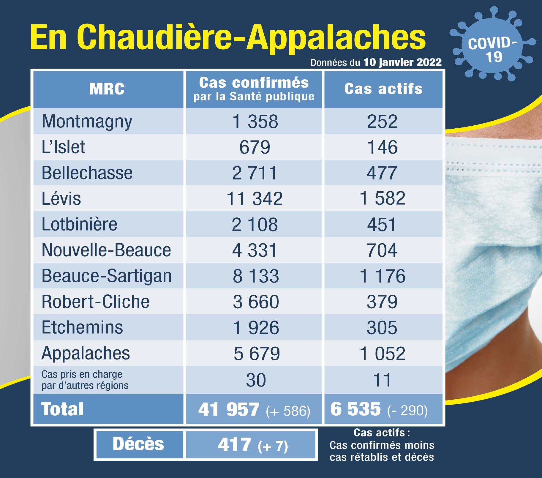 Pour les nouveaux cas confirmés, ils sont au nombre de 586, dont 201 pour la Beauce-Etchemin: 71 pour la MRC Beauce-Sartigan, 73 pour Robert-Cliche, 39 en Nouvelle-Beauce et 18 pour Les Etchemins.