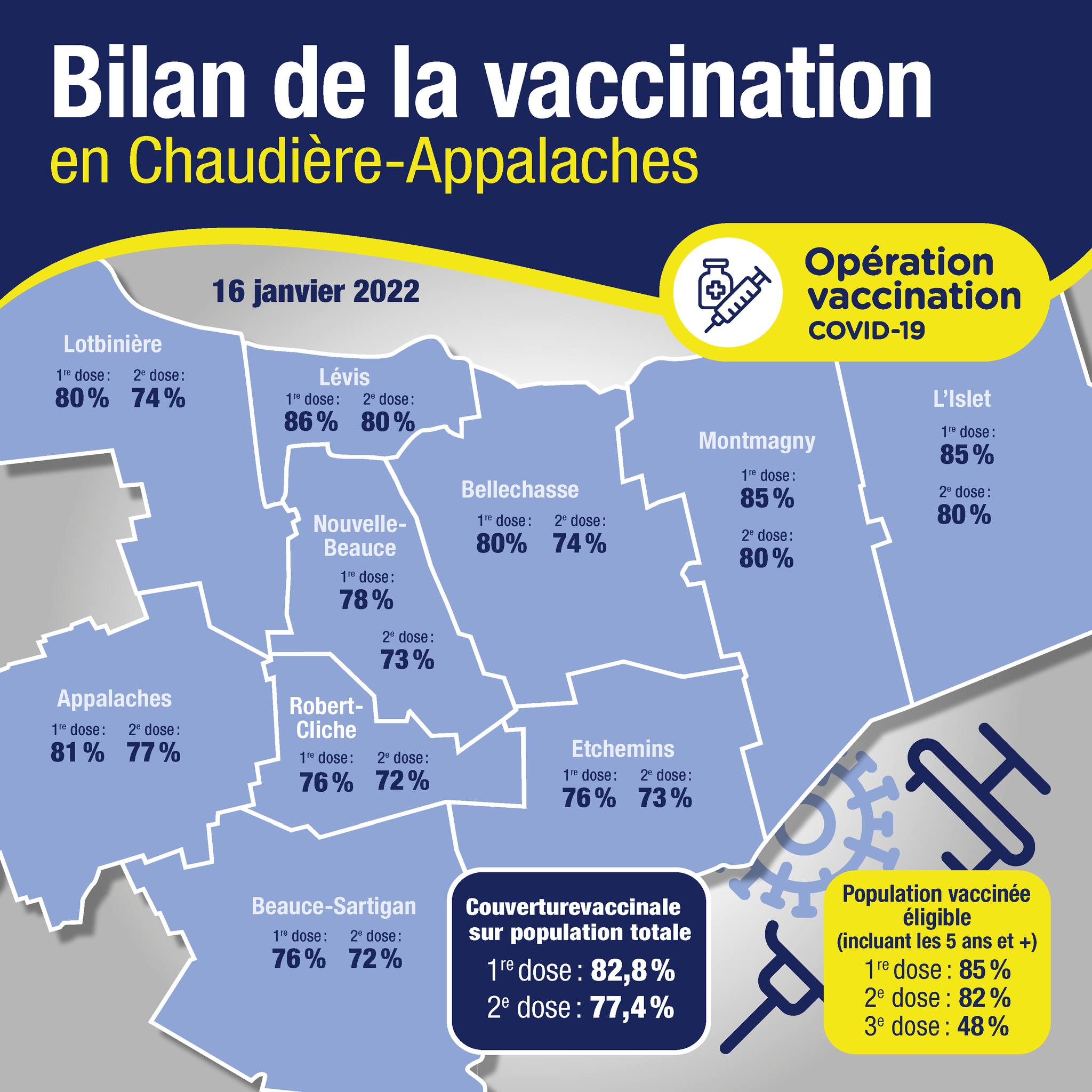 Depuis le 10 janvier, 48 371 doses de vaccin ont été administrées en Chaudière-Appalaches pour un total de 863 184 doses à ce jour. Cela représente une couverture vaccinale pour la première dose de 82,8 % de la population de Chaudière-Appalaches.