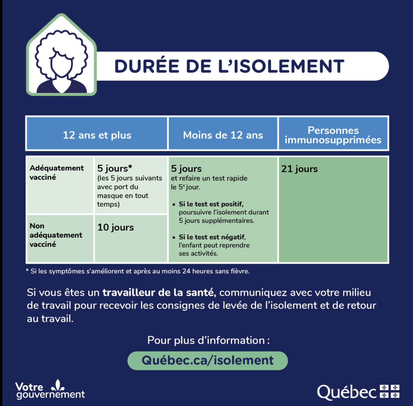 Pour les personnes adéquatement vaccinées de 12 ans et plus et qui ont des symptômes de COVID-19, doivent s’isoler pour une durée de 5 jours. Si après que les symptômes s’améliorent et que pendant 24 h il n’y a plus de fièvre, ils peuvent sortir de leur isolement, mais doivent porter le masque en tout temps les 5 jours qui suivent.