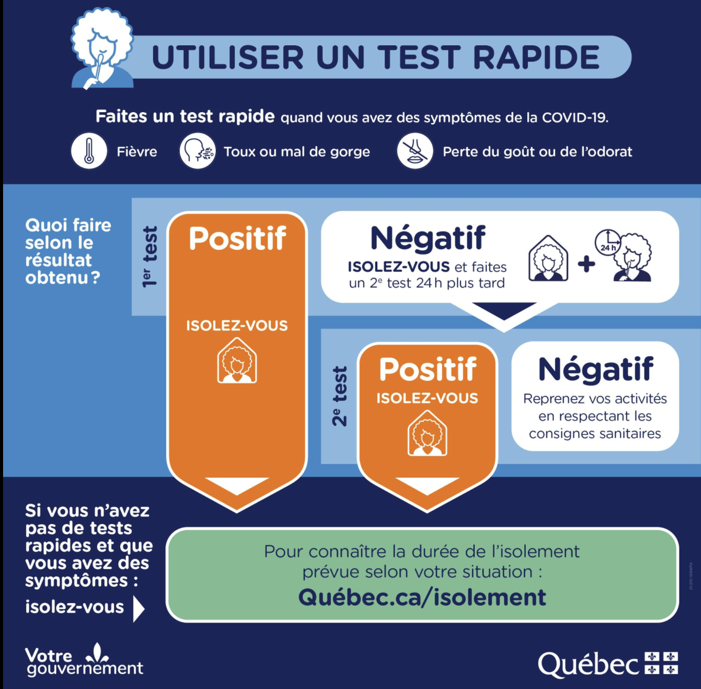 En présence de symptômes, vous devez faire un premier test rapide. Qu’il soit positif ou négatif, vous devez vous isoler. La différence c’est que s’il est négatif, vous devez en refaire un deuxième dans les 24 h qui suivent.