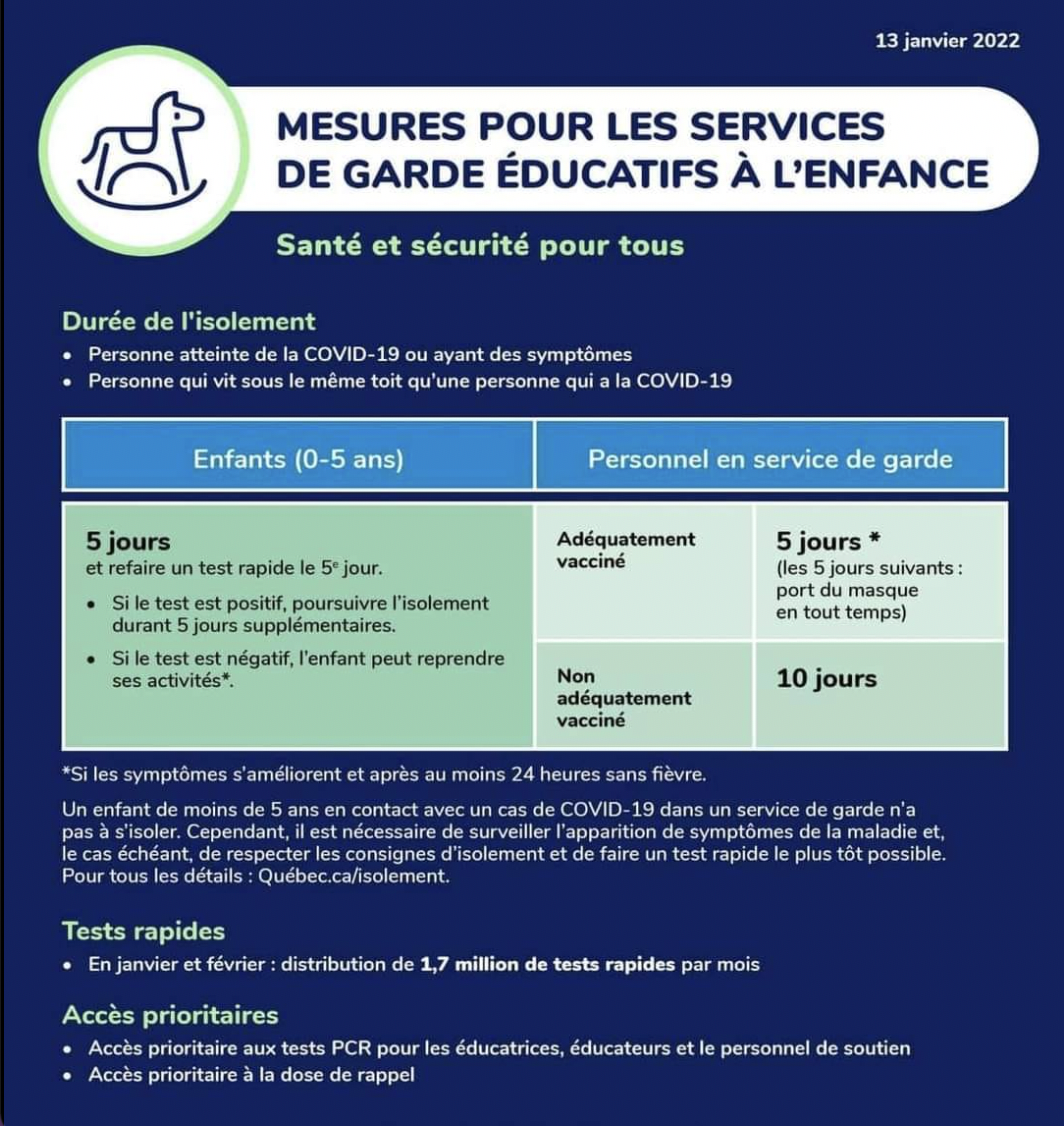 « Un enfant de moins de 5 ans en contact avec un cas de COVID-19 dans un service de garde n’a pas à s’isoler. Cependant, il est nécessaire de surveiller l’apparition de symptômes de la maladie et, le cas échéant, de respecter les consignes d’isolement et de faire un test rapide le plus tôt possible. »