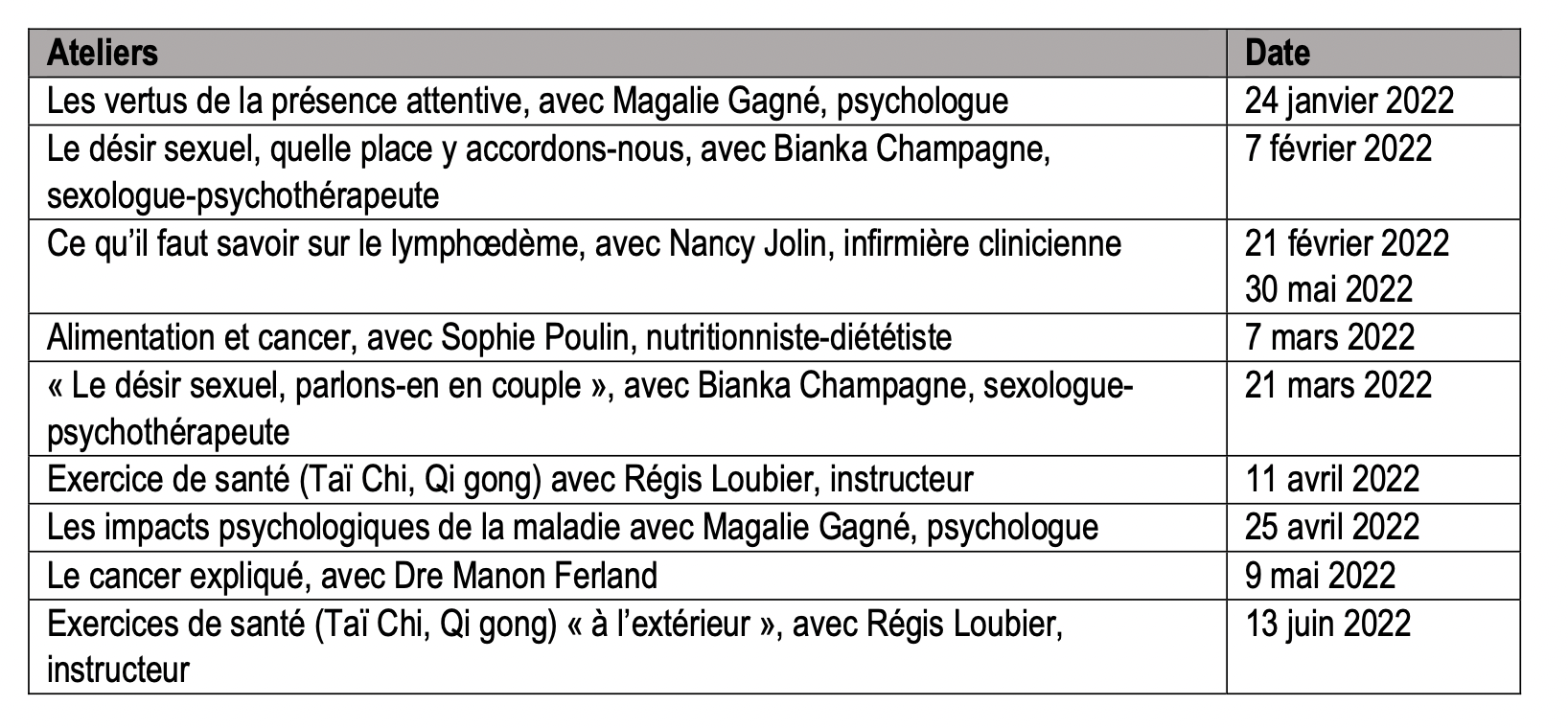 Voici la liste des ateliers qui auront lieu pendant l’hiver et le printemps 2022.