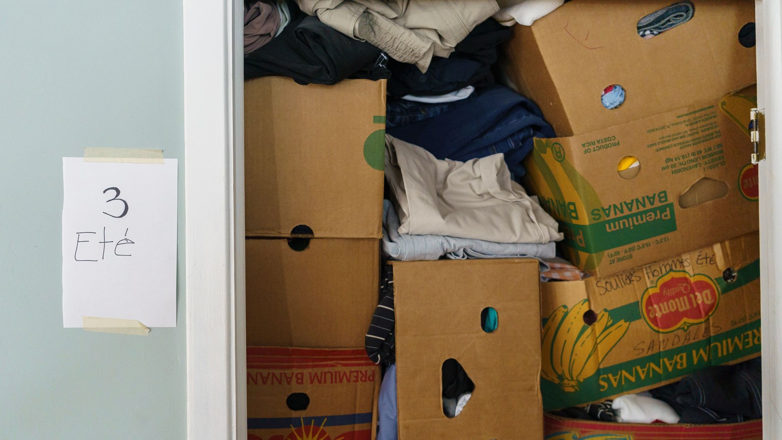 Les vêtements arrivent donc à l’étage par le monte-charge et sont transmis au premier triage. Ici, deux personnes séparent le linge d’adultes dans des bacs pour l’hiver ou pour l’été. C’est la même chose pour les enfants. Chaque type de vêtements a sa caisse attitrée, par exemple les sous-vêtements, les pantalons, les hauts, etc. Toutes les boîtes sont ensuite stockées dans des chambres, une pour l’hiver et une pour l’été.