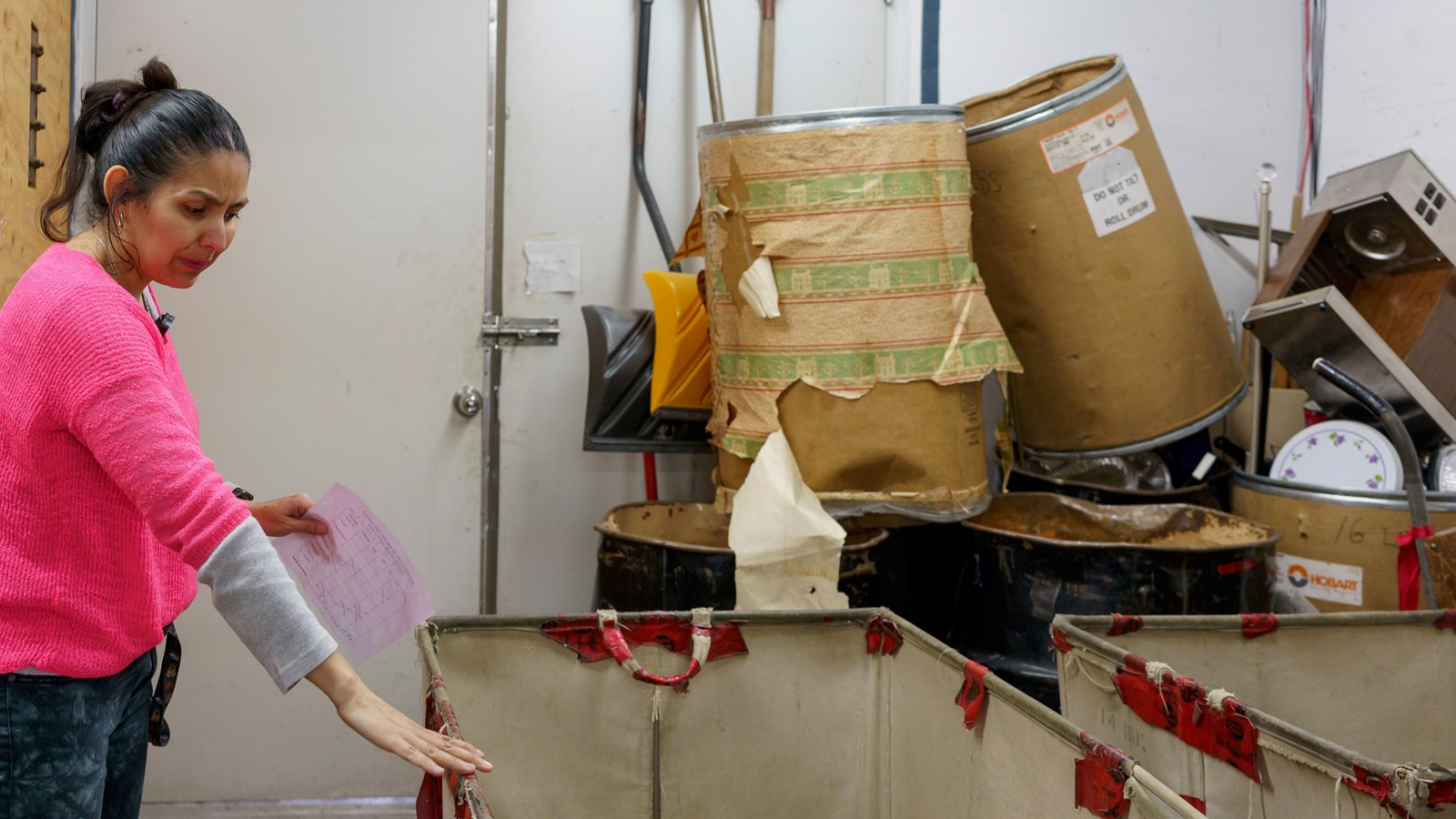 À l’intérieur, les sacs de vêtements sont transportés d’un bout à l’autre du bâtiment dans de grands bacs en plastique sur roulettes. Ils sont d’abord pesés et enregistrés avant d’être envoyés au triage.