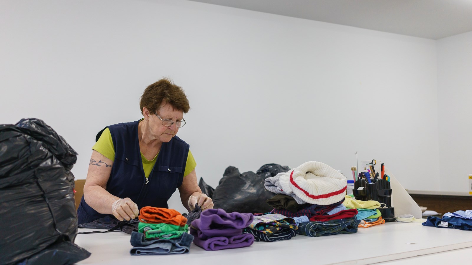 Ici, deux personnes séparent le linge d’adultes dans des bacs pour l’hiver ou pour l’été.