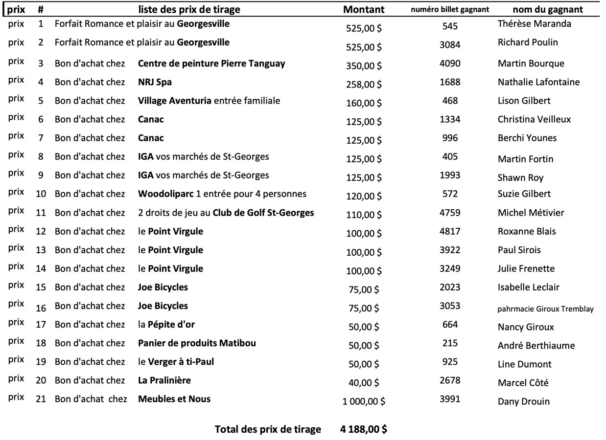 Les 21 détenteurs des canards gagnants se sont partagé des prix totalisant 4188 $. Cette campagne de financement sert pour le fonctionnement du CNRB, pour le remplacement des équipements et pour garder des entraîneurs qualifiés.