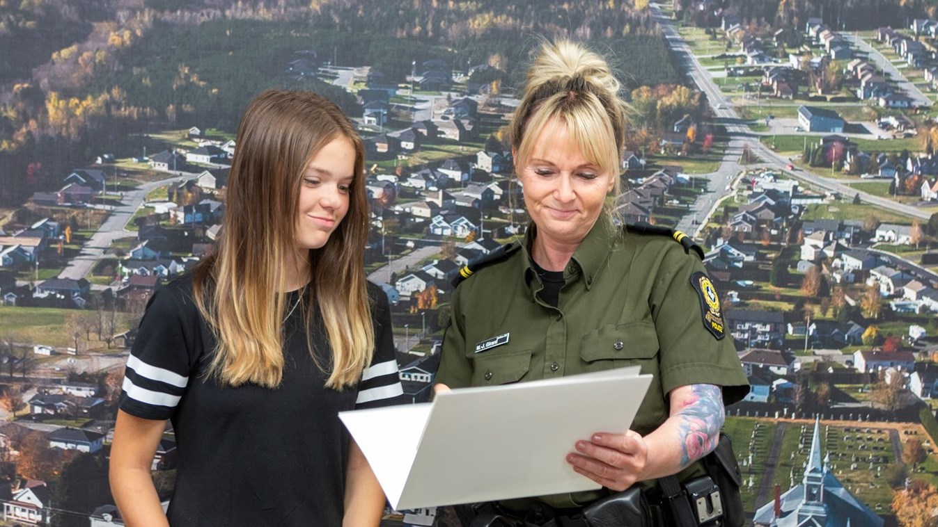 L'agente Marie-Joëlle Girard, coordonnatrice en police communautaire au poste de la MRC Nouvelle-Beauce, remet un certificat de collaboration au nom de la Sûreté du Québec