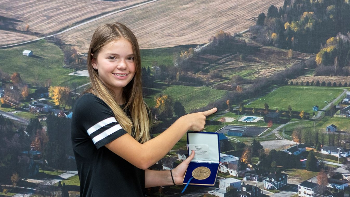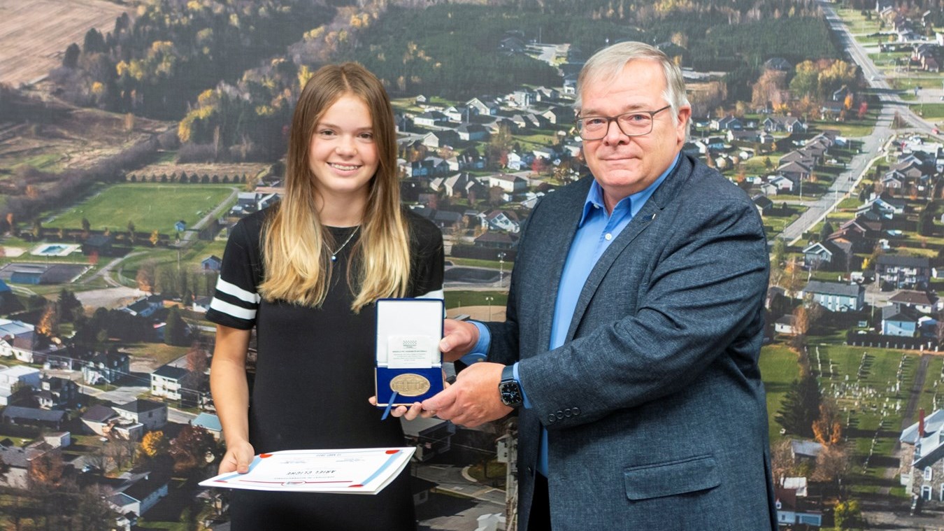 La jeune Ariel Cliche, âgée de 13 ans, s'est vue remettre ce matin la médaille de l’Assemblée nationale du Québec pour avoir sauvé un enfant de la rivière Savoie à Saint-Elzéar, le 10 avril dernier.
