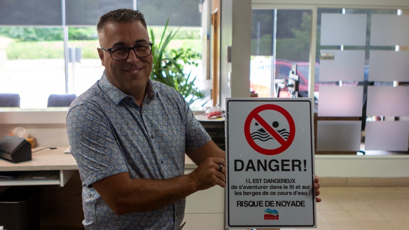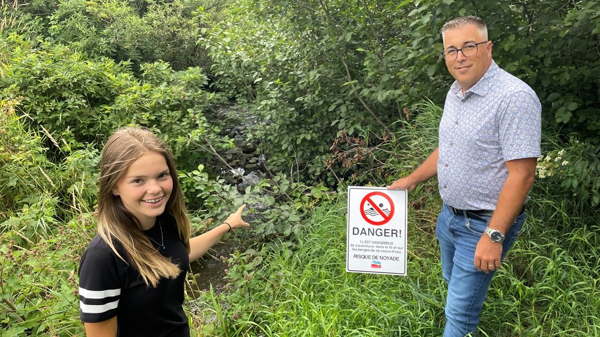 Carl Marcoux, présentent les panneaux qui seront installés au abord de la rivière Savoie