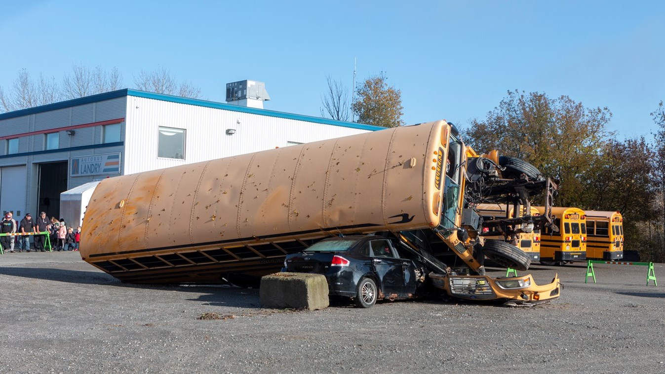 Leur directeur, Serge Fecteau, a profité d’une offre de Autobus Landry pour simuler un accident impliquant un bus scolaire avec 21 enfants à bord ainsi qu’une voiture avec trois personnes (ici, des mannequins).