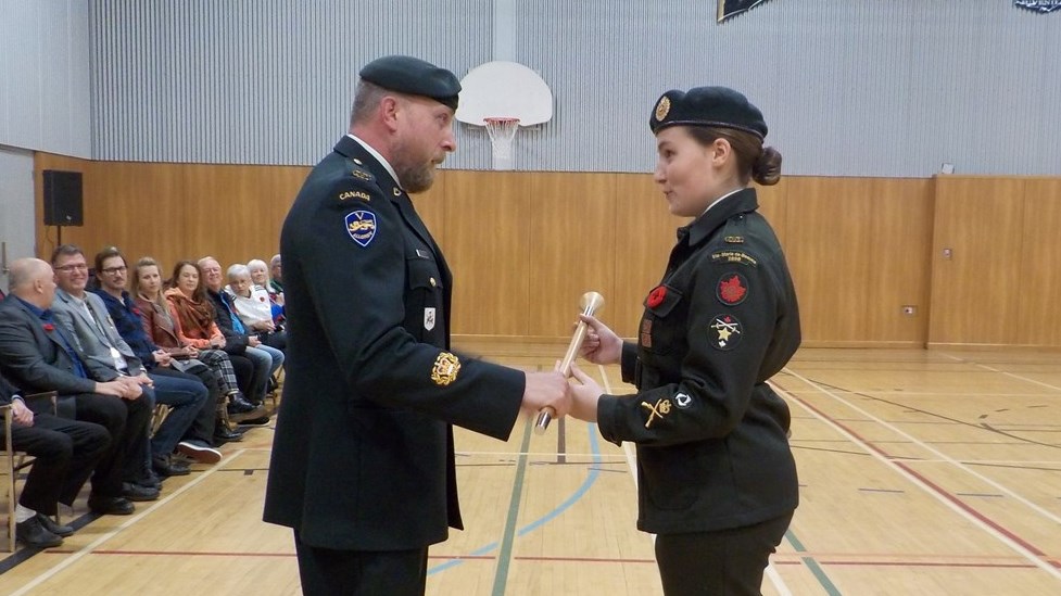L’adjudant Marianne Felteau reçoit sa badine des mains de l’adjudant-maître Malenfant du 5e Régiment du Génie Royal Canadien.