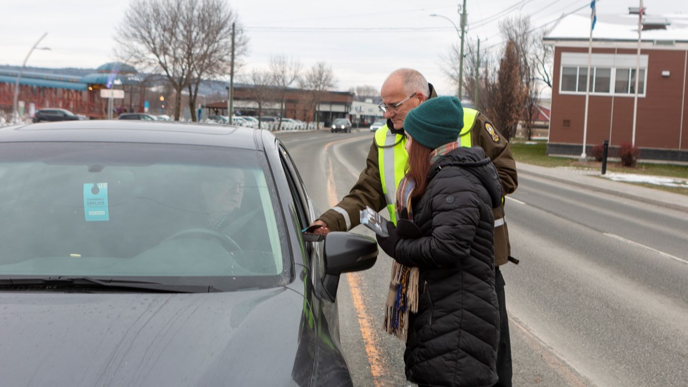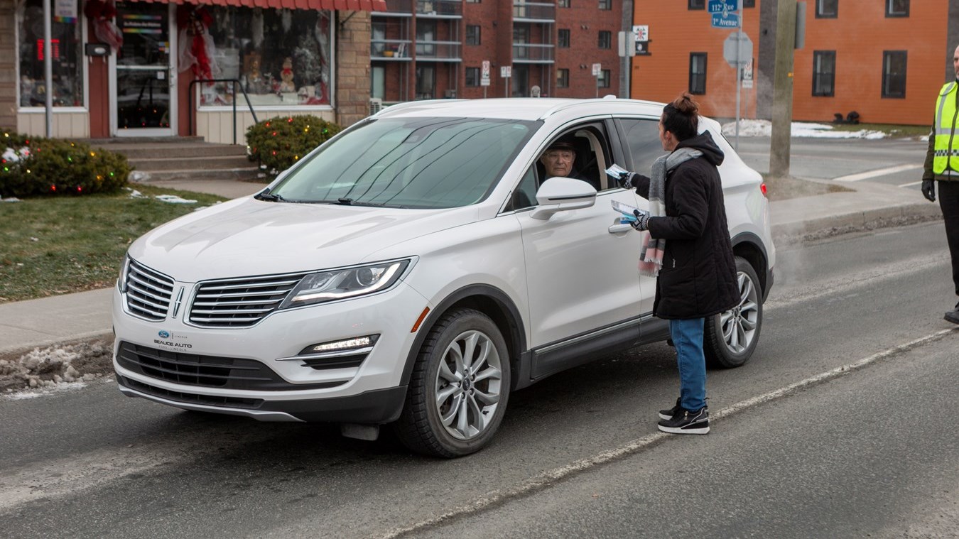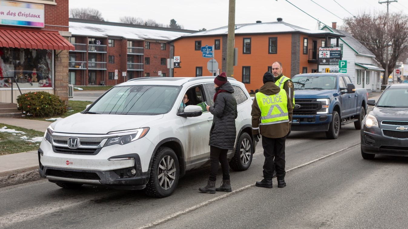 Les agents de police et le personnel de ces organismes s'étaient installés sur le bord de la route près du centre sportif Lacroix-Dutil ce matin et seront à Thetford Mines cet après-midi. Ils interpellent les passants et leur remettent des documents informatifs. L'opération est menée partout sur le territoire de la Sûreté du Québec. Au total, ce sont 89 opérations de sensibilisation auront lieu aujourd'hui.