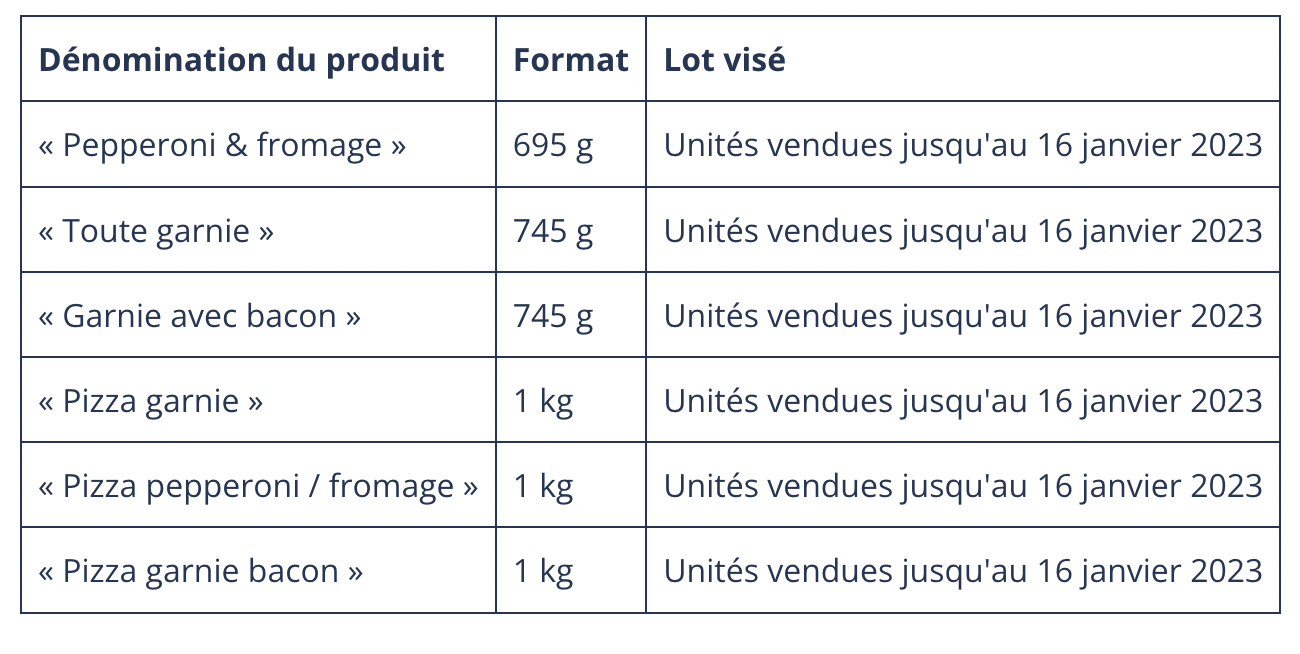 Les produits qui font l'objet de la présente mise en garde ont été offerts à la vente jusqu'au 16 janvier 2023, et ce, dans plusieurs établissements de la province de Québec. Les produits étaient emballés dans des boîtes de carton et vendus à l'état congelé. L'emballage ou l'étiquette des produits comportait, outre leur dénomination, la mention « Pizzéria Québec Express » ou « Viking Pizza ».