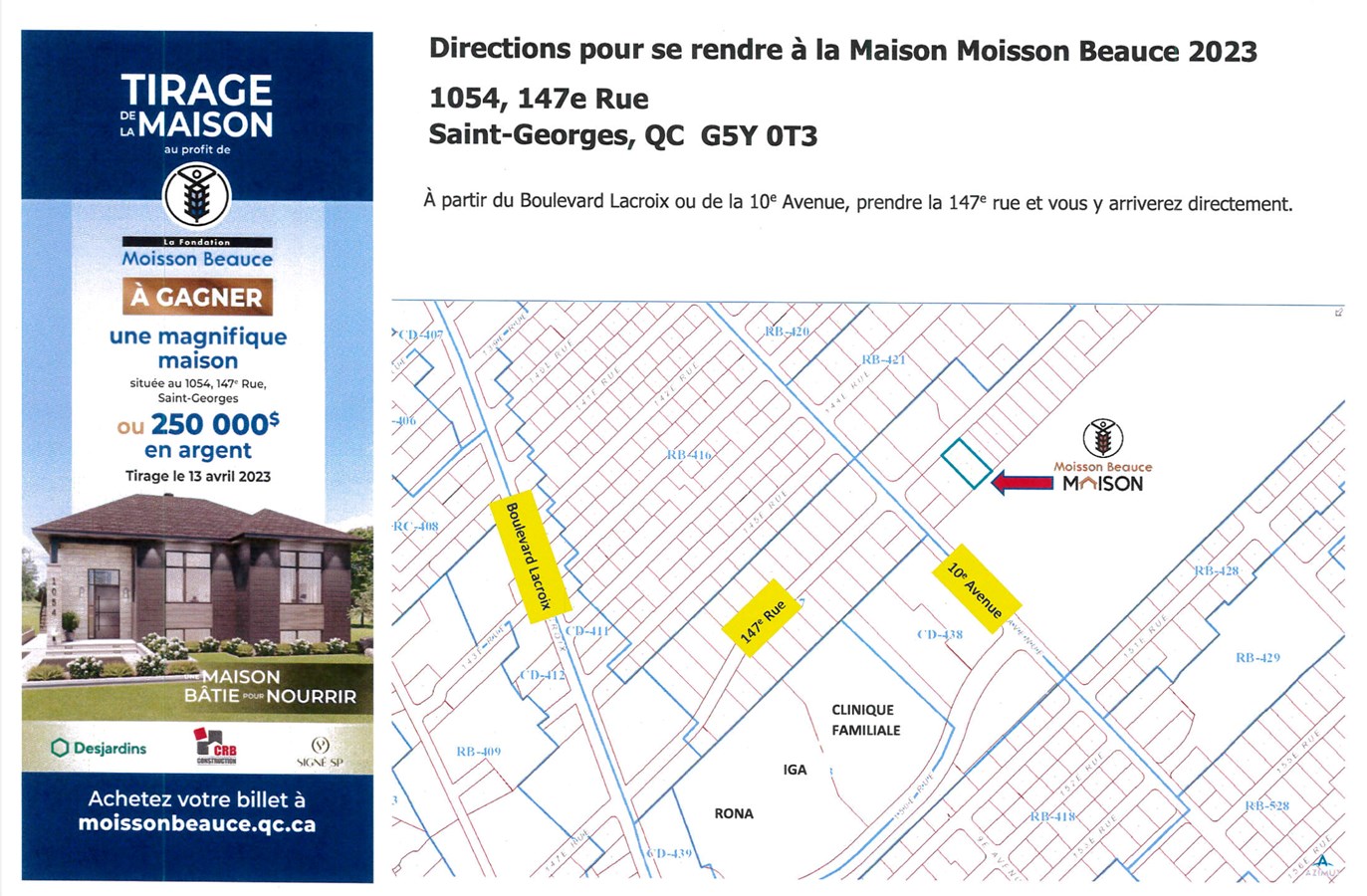 De plus, chaque billet donne une entrée gratuite à l’Expo Habitat de Thetford et une entrée gratuite à l’Expo Habitat de Saint-Georges. Les billets sont en vente sur https://www.moissonbeauce.qc.ca/tirage-de-la-maison-moisson-beauce et dans plusieurs points de vente dans la région :