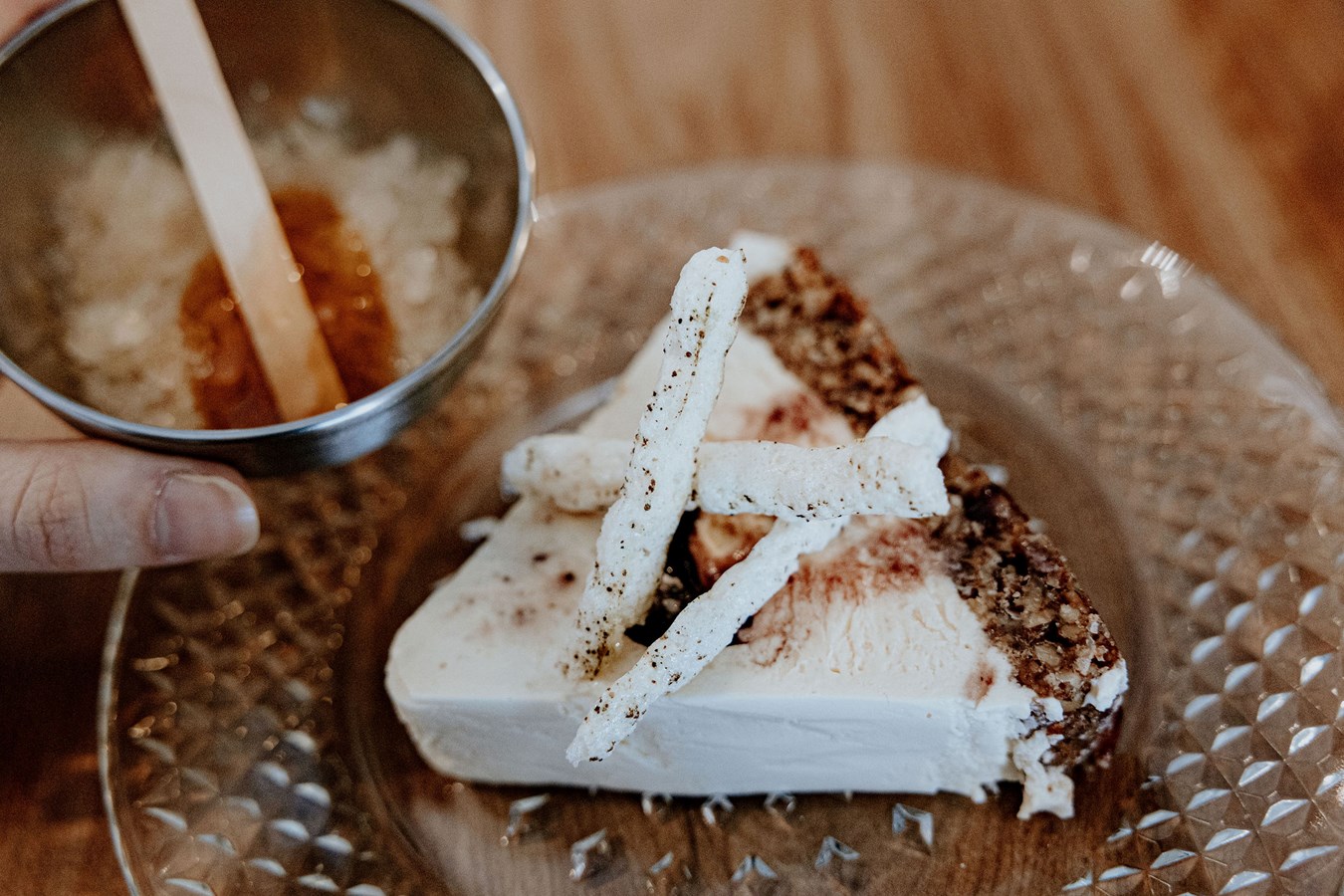 Le gâteau bavarois à l’érable, coeur de bleuets, croustillant aux noix d’érable, meringue au poivre clavalier, accompagné d’un granité au cidre de feu et de son bâtonnet de tire est une création du chef Ariel Cardinal-Petit. Les produits de la Bleuetière Goulet, des Roy de la pomme, de la Laiterie Royalla et des Fermes Stafford ont notamment été mis en valeur dans le dessert.