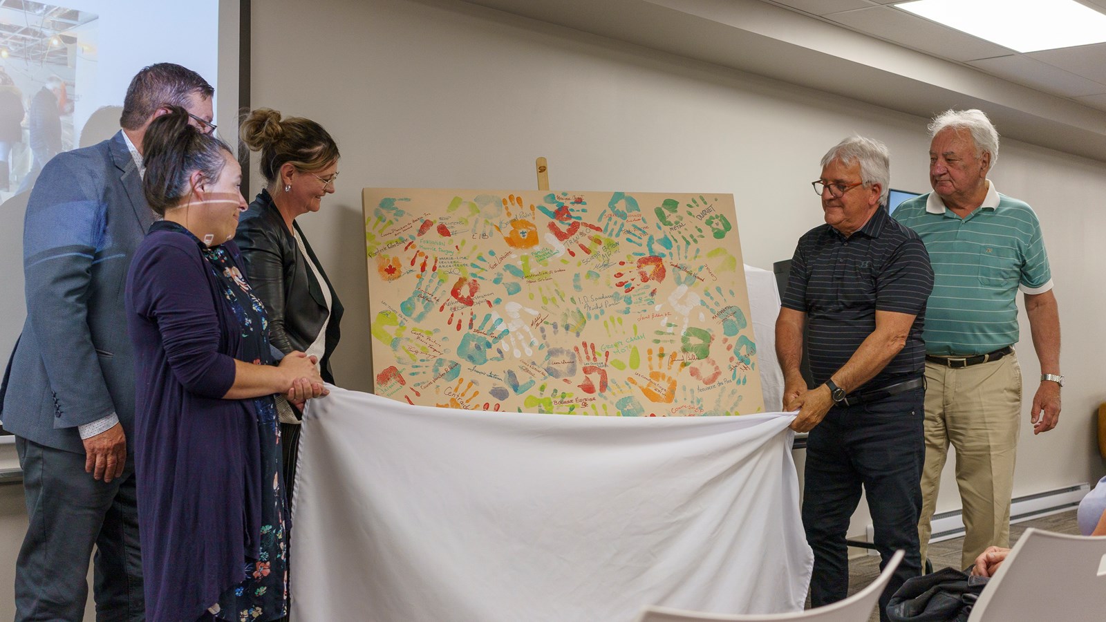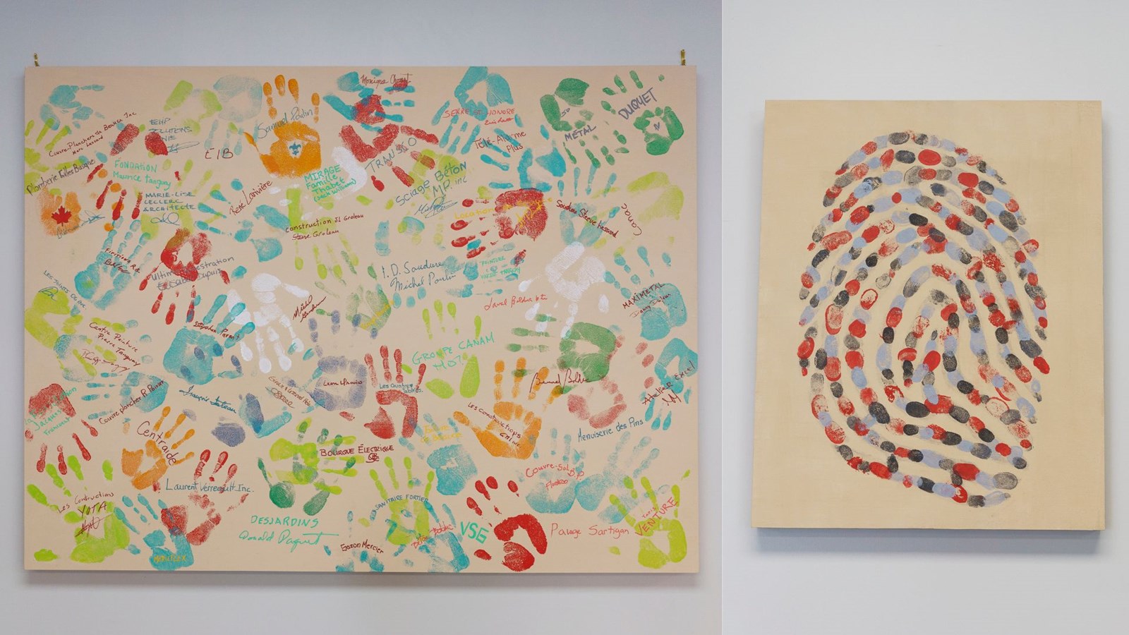 « Merci pour le coup de main » est une toile où sont peintes toutes les mains des représentants des différents partenaires qui ont participé à la réalisation de cette nouvelle bâtisse.