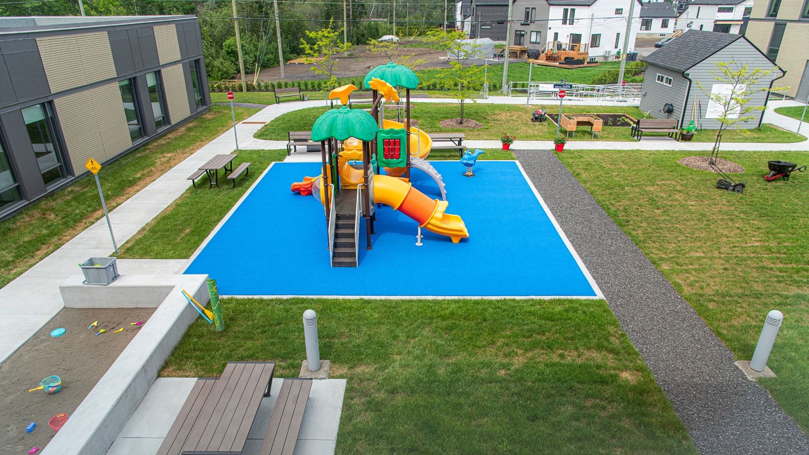 Cette cour extérieure recrée un véritable milieu de vie afin que les usagers puissent réaliser et/ou développer de nombreuses activités malgré une situation de handicap. Pour favoriser cette réintégration à leur milieu de vie, cette cour est aménagée avec différents sentiers en gravier, sable et asphalte, de pentes, de trottoirs, de gazon, d’un potager, de panneaux de circulation pour la déficience visuelle, de mobiliers urbains adaptés, d’un cabanon/atelier, d’une rampe d’accès pour fauteuil roulant pour initier les personnes à mobilité réduite, d’un module de jeux sécuritaire et de différents accessoires.