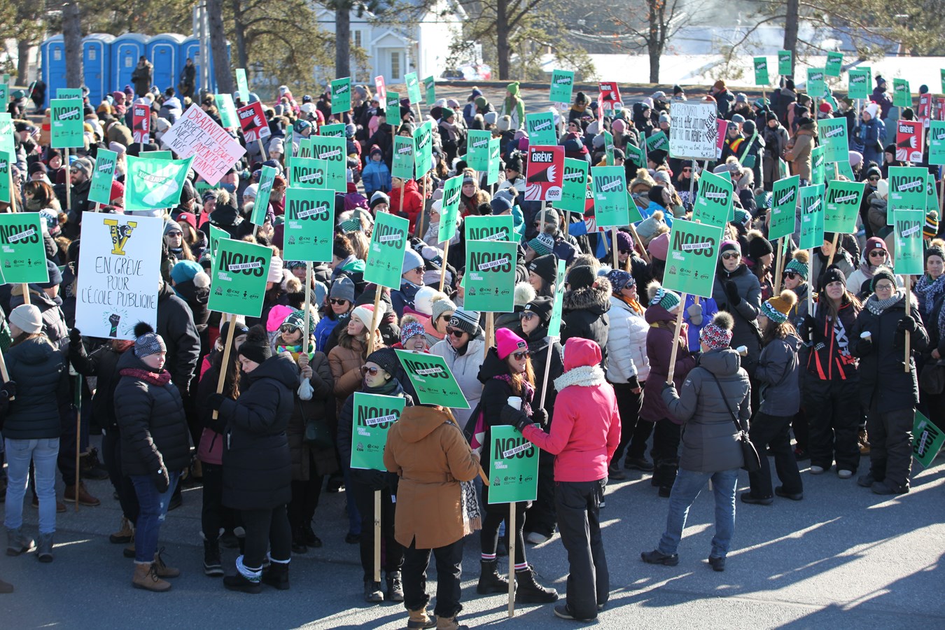 En grève pour trois jours, les représentants du Front Commun en Beauce ont rassemblé plusieurs centaines de personnes devant les locaux du Centre de services scolaire de la Beauce-Etchemin (CSSBE), ce mardi 21 novembre.