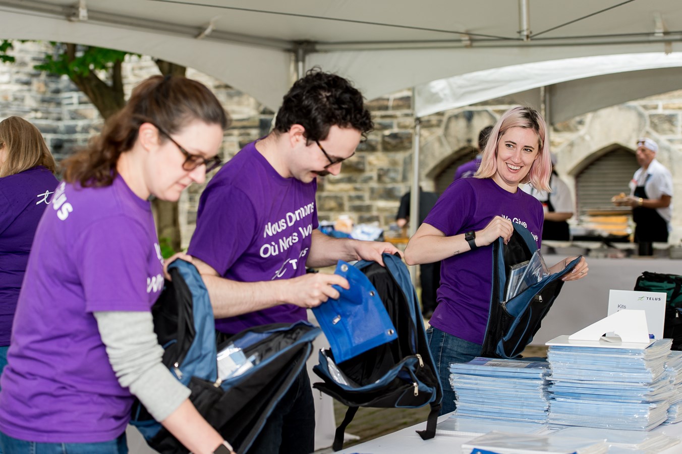 Les Ambassadeurs communautaires de TELUS, ont préparé, dans les dernières semaines, près de 82 sacs d'écoles remplis de fournitures scolaires, afin de les remettre à la Société de Saint-Vincent de Paul de Saint-Joseph-de-Beauce, et de la Rive-Sud de Québec.